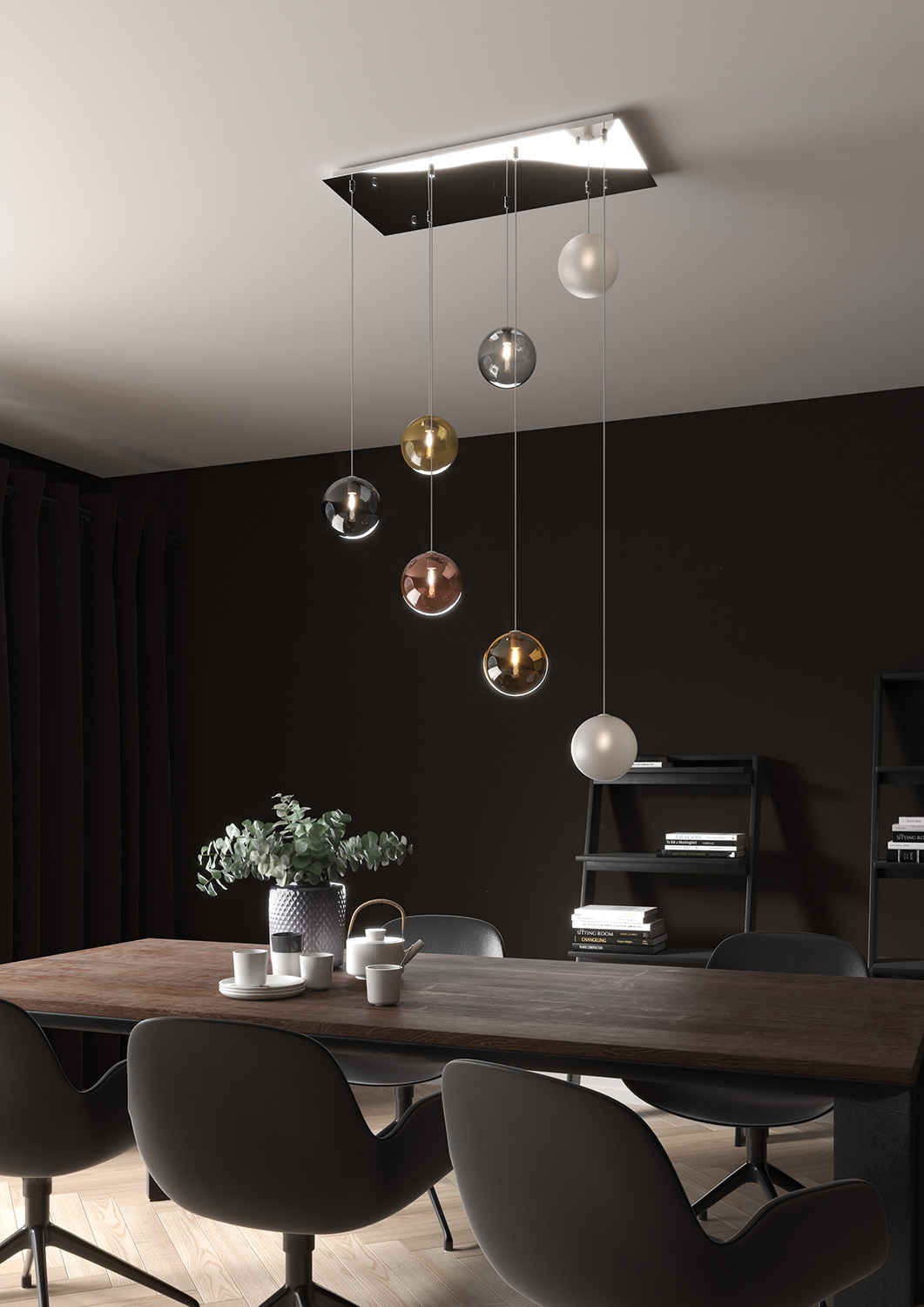 Collezione ECLIPSEIL BENVENUTO ALLA LUCESospensione 5 luci regolabile in altezza, composta da una struttura metallo cromo, un rosone rettangolare e sfere di vetro pi..
