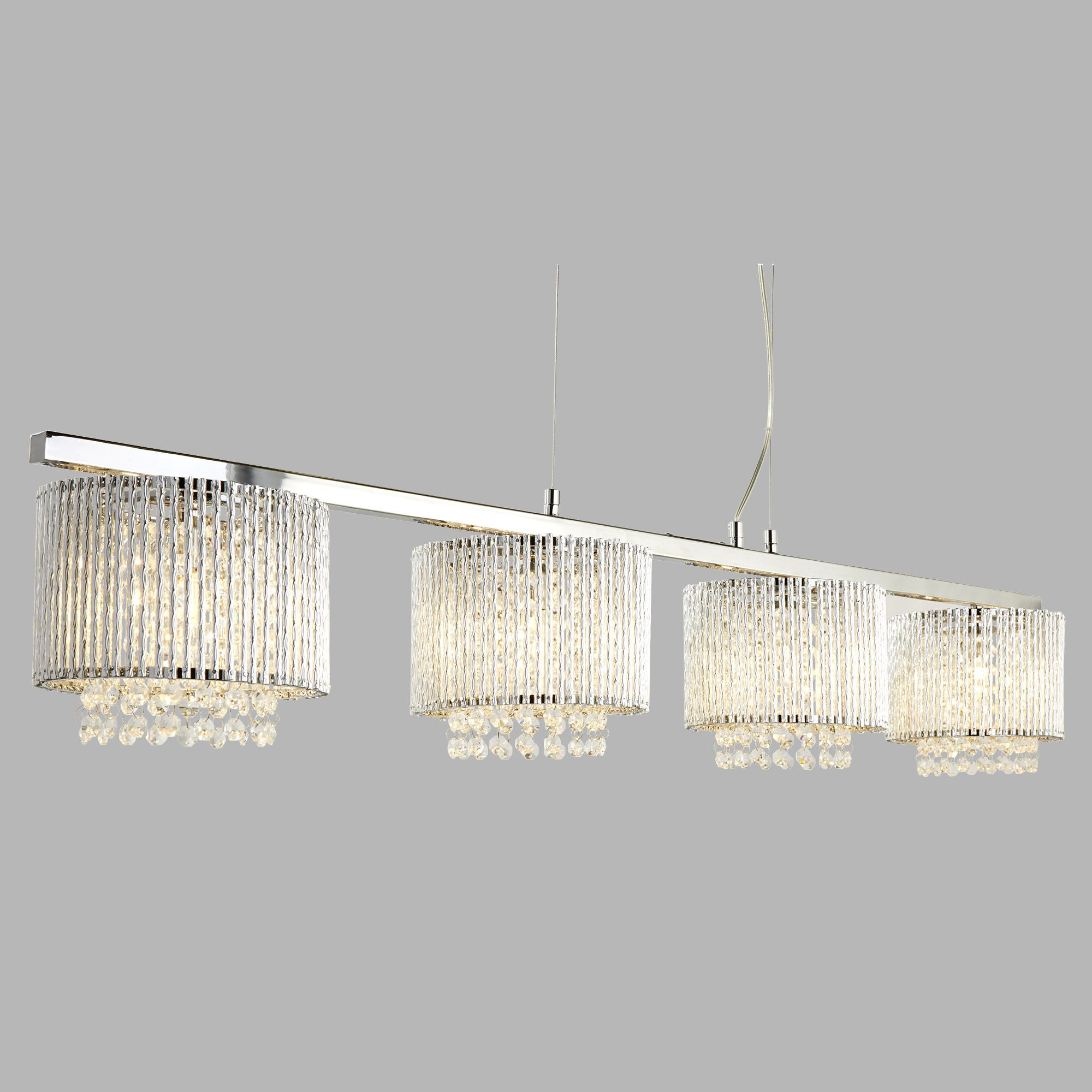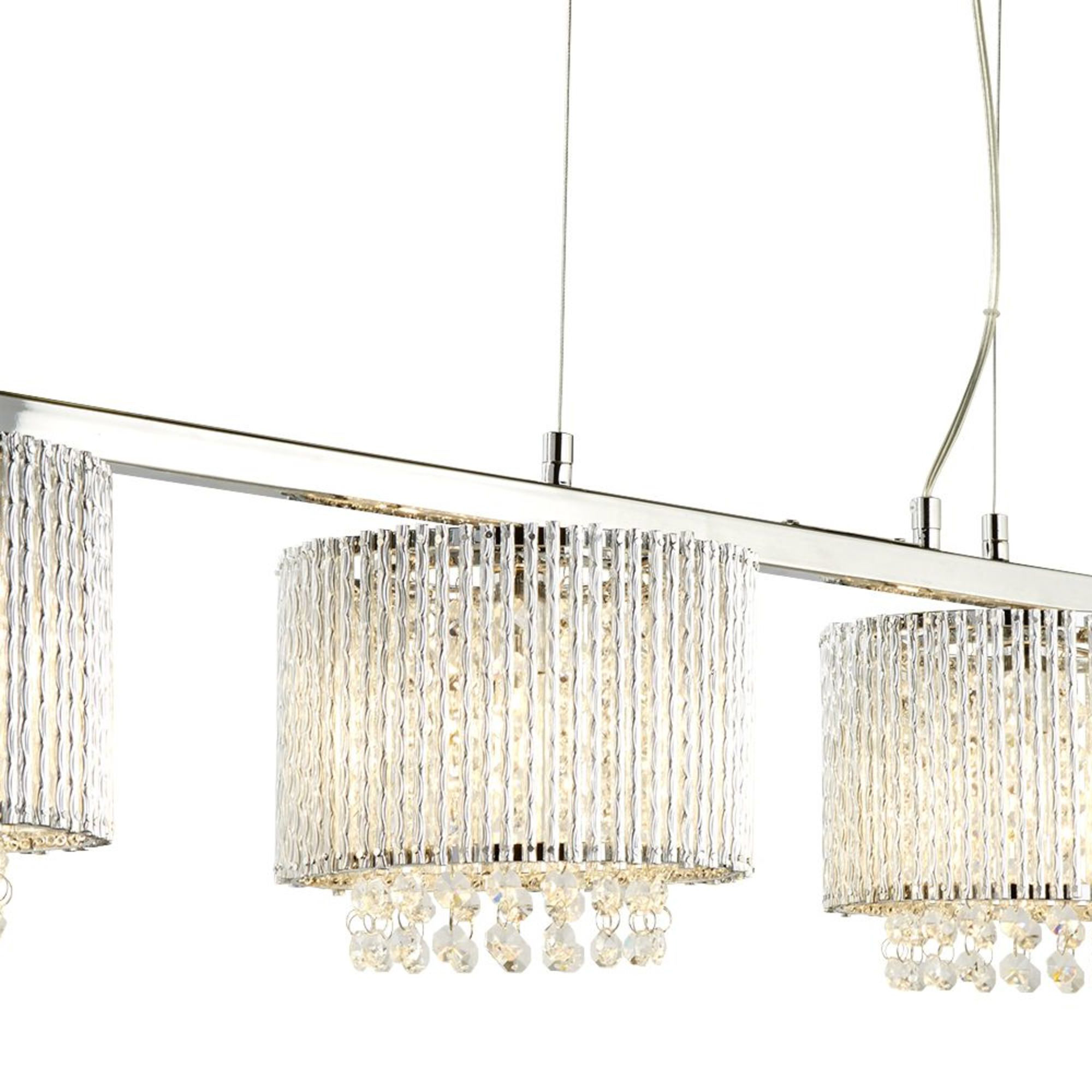 La barra da soffitto Elise II dona immediatamente glamour a qualsiasi stanza. Ideale sopra un tavolo da pranzo, questa splendida sospensione a 4 luci è elegante e sofisticata. Con aste rotanti in alluminio e gocce di cristallo che scendono a cascata dal raccordo regolabile in altezza cromato lucido, Elise II porterà il fattore wow.