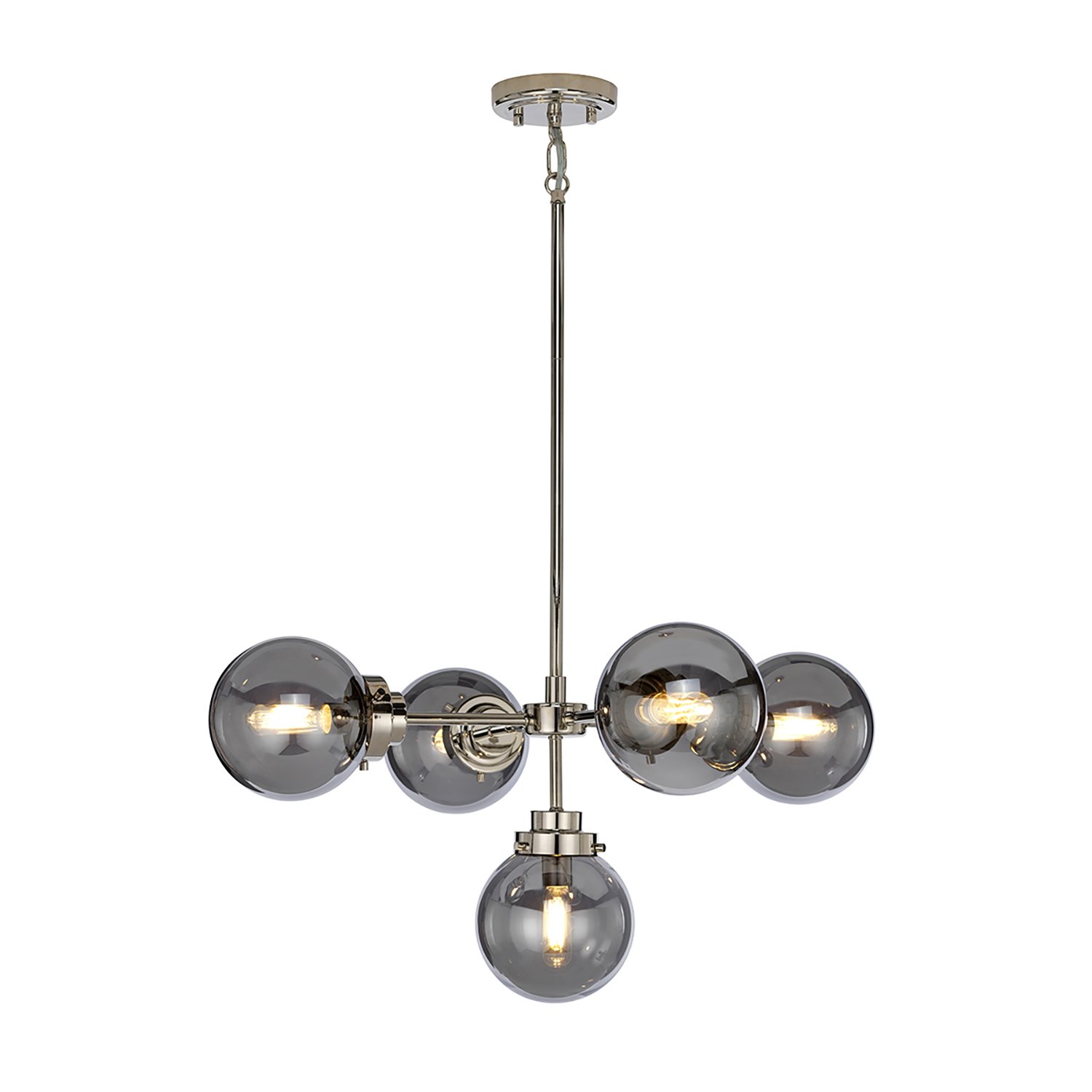 Lampadario a 5 luci. Le forme a globo e i bracci lineari si combinano per creare una nuova immagine dello stile retrò moderno. I paralumi in vetro specchiato semitrasparente aggiungono fascino e praticità, in una gamma che offre uno stile per interni moderni e più classici.