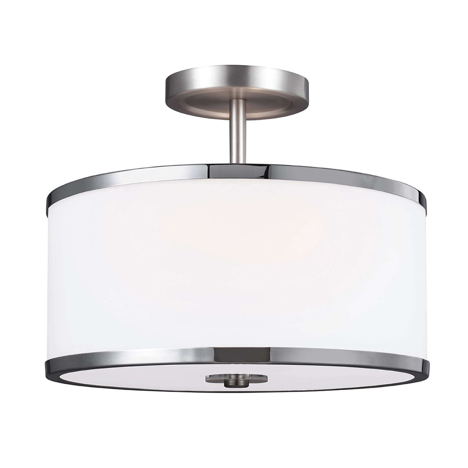 Lampada a soffitto a 2 luci. Prospect Park riprende un profilo tradizionale e lo modernizza con elementi di design aggiornati per creare un'atmosfera da quartieri alti. I bracci in nichel satinato sono impreziositi da componenti cromati e le bande cromate sono presenti nella parte superiore e inferiore di ciascun paralume cilindrico in vetro opalino acidato. Il cristallo trasparente pressato su ogni stelo eleva il look sartoriale con un pizzico di glamour.