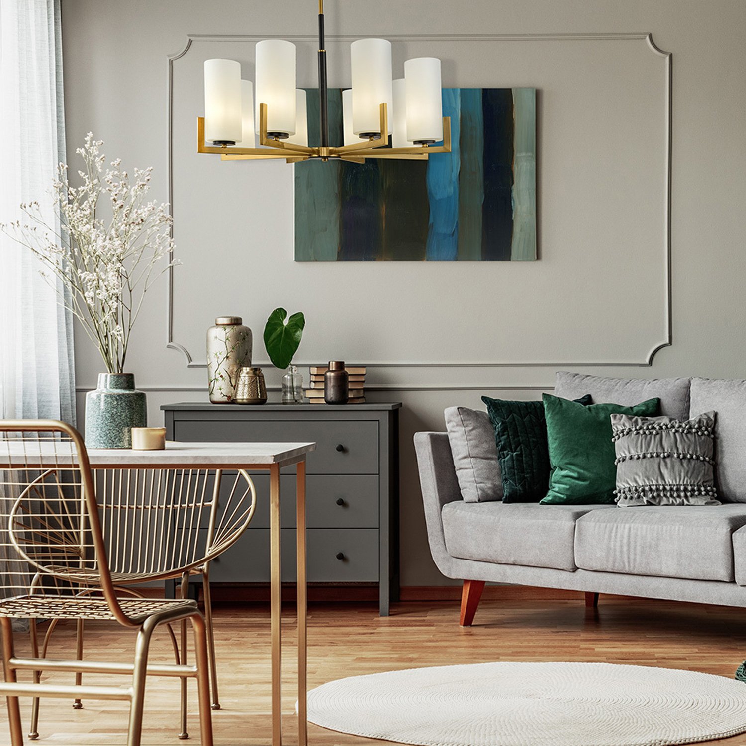 Il lampadario contemporaneo serie Fortano è un elegante lampadario a 8 luci, con una struttura in metallo di colore ottone e diffusori in vetro bianchi.. La particolarità di questo lampadario risiede nella scelta di alcuni elementi tinti di nero a contrasto, che donano un tocco di originalità e contemporaneità. I diffusori cilindrici e le luci rettangolari conferiscono al lampadario un design moderno e pulito, perfetto per arricchire qualsiasi ambiente con una luce diffusa e piacevole. Grazie alla sua eleganza e alla sua versatilità, è ideale per illuminare saloni, soggiorni, sale da pranzo e altre aree comuni, sia in contesti residenziali che commerciali. La struttura in metallo è resistente e duratura, mentre i diffusori in vetro bianchi diffondono una luce uniforme e gradevole, adatta a creare un'atmosfera accogliente e rilassante. Inoltre, il lampadario Fortano è facile da installare e da utilizzare, e può essere regolato in altezza per adattarsi alle diverse esigenze di illuminazione.