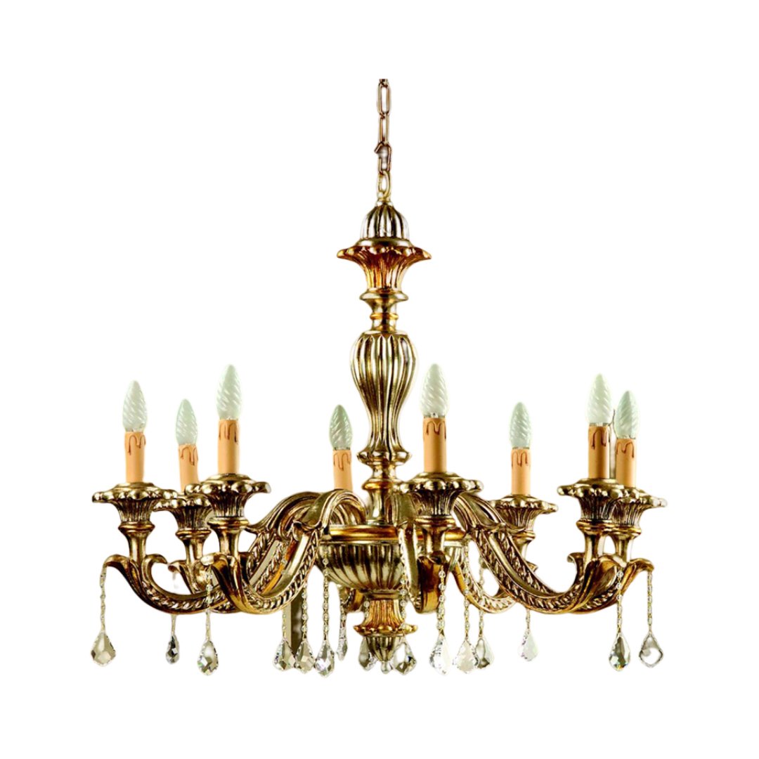 Lampadario realizzato a mano dai nostri mastri artigiani seguendo le più antiche tradizioni del legno. Struttura in legno intarsiato color argento mecca.. Monta 8 lampadine E14 (non inclusa) . Adatto ad un arredamento classico e raffinato