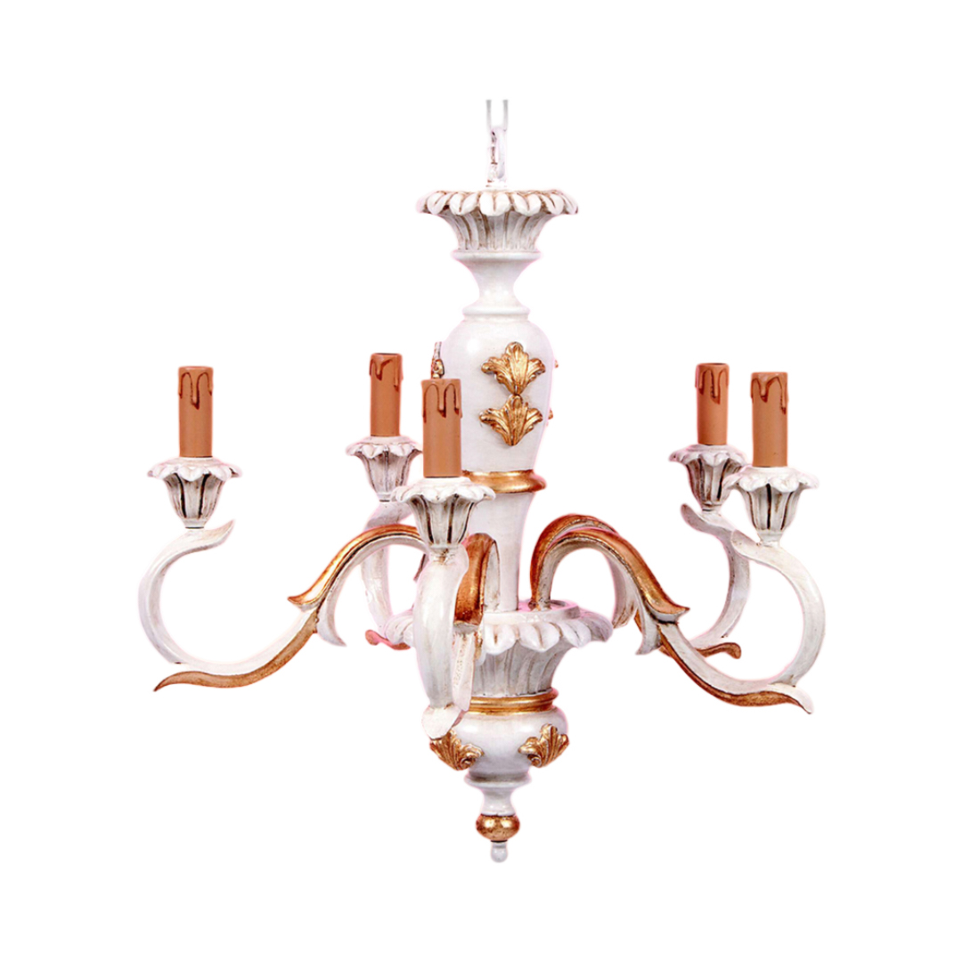 Lampadario realizzato a mano dai nostri mastri artigiani seguendo le più antiche tradizioni del legno. Struttura in legno intarsiato color avorio e oro.. Monta 5 lampadine E14 (non inclusa) . Adatto ad un arredamento classico e raffinato