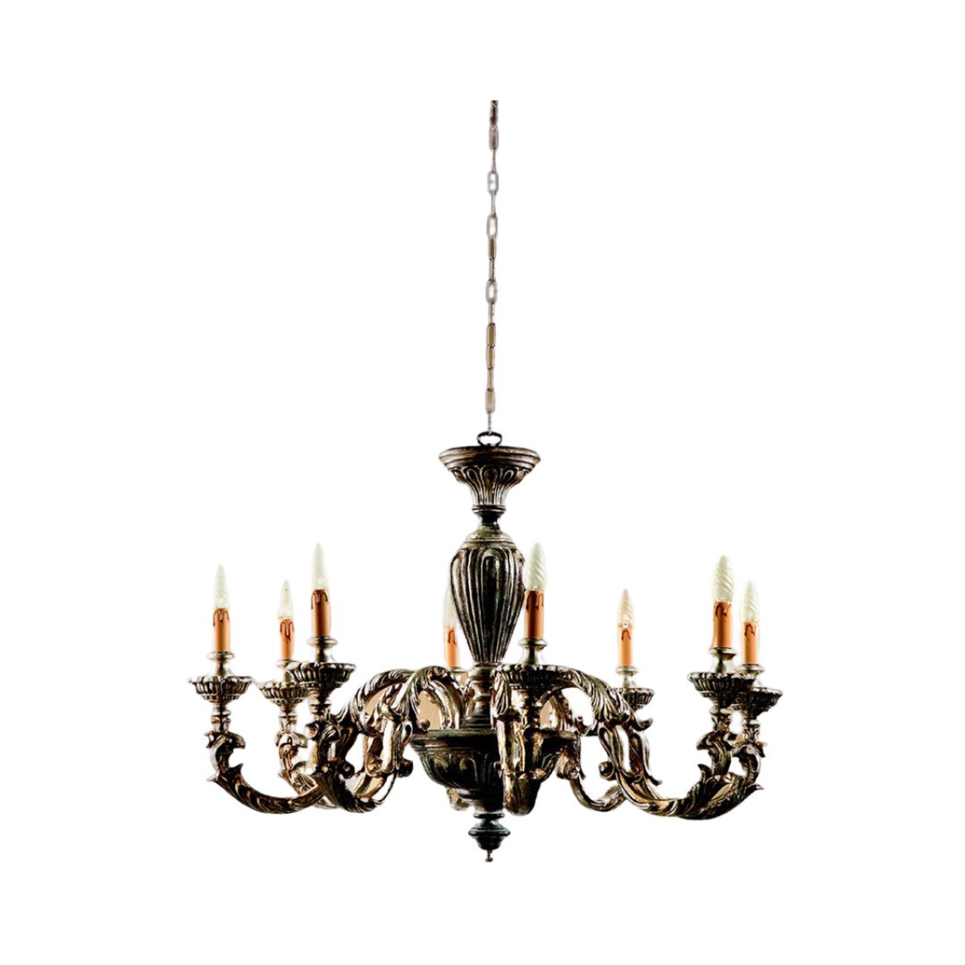Lampadario realizzato a mano dai nostri mastri artigiani seguendo le più antiche tradizioni del legno.. Struttura in legno intarsiato color marrone e argento etrusco. Monta 8 lampadine E14 (non inclusa) . Adatto ad un arredamento classico e raffinato
