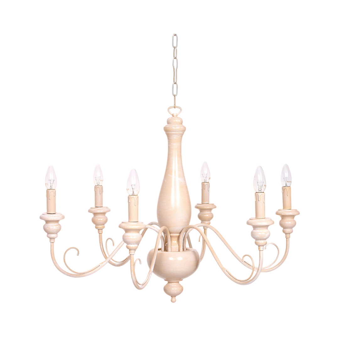 Lampadario realizzato a mano dai nostri mastri artigiani seguendo le più antiche tradizioni del legno. Struttura in legno intarsiato color ocra sbiancato.. Monta 6 lampadine E14 (non inclusa) . Adatto ad un arredamento classico e raffinato
