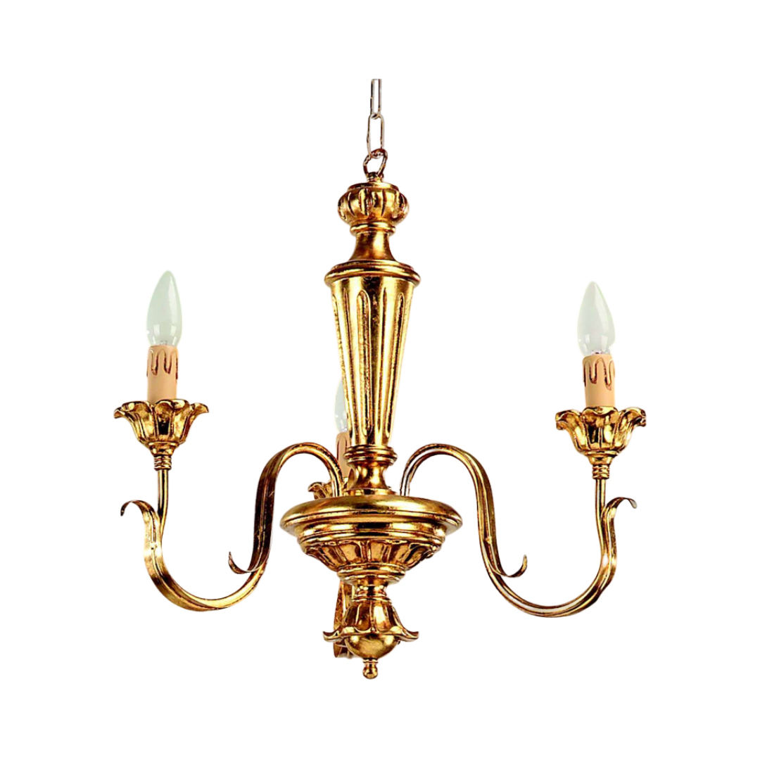 Lampadario realizzato a mano dai nostri mastri artigiani seguendo le più antiche tradizioni del legno. Struttura in legno intarsiato color oro.. Monta 3 lampadine E14 (non inclusa) . Adatto ad un arredamento classico e raffinato