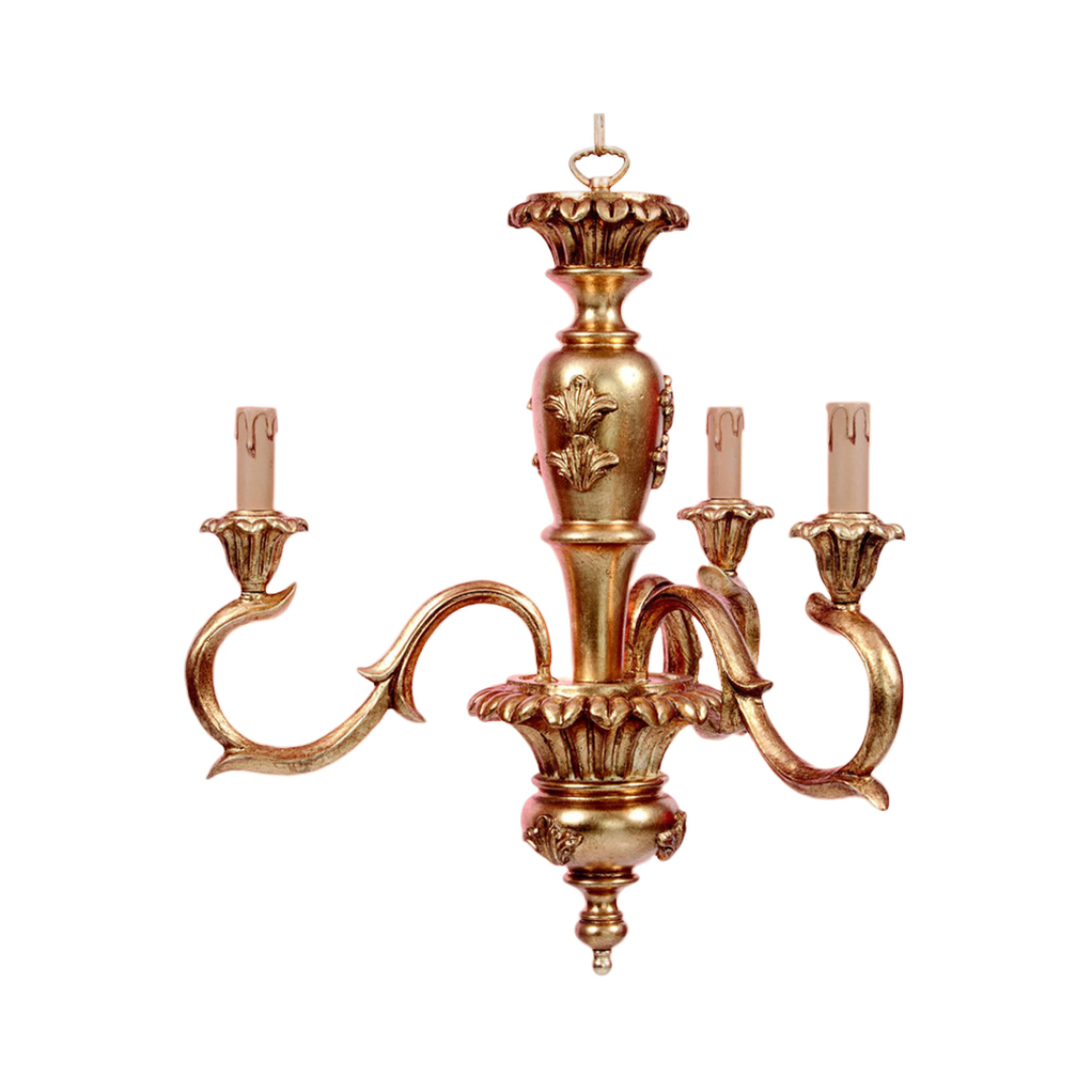 Lampadario realizzato a mano dai nostri mastri artigiani seguendo le più antiche tradizioni del legno. Struttura in legno intarsiato color oro.. Monta 3 lampadine E14 (non inclusa) . Adatto ad un arredamento classico e raffinato