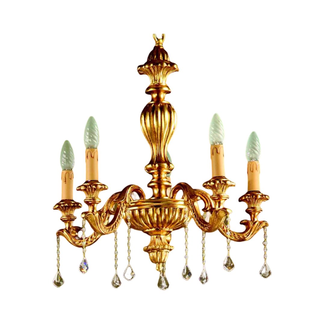 Lampadario realizzato a mano dai nostri mastri artigiani seguendo le più antiche tradizioni del legno. Struttura in legno intarsiato color oro.. Monta 5 lampadine E14 (non inclusa) . Adatto ad un arredamento classico e raffinato
