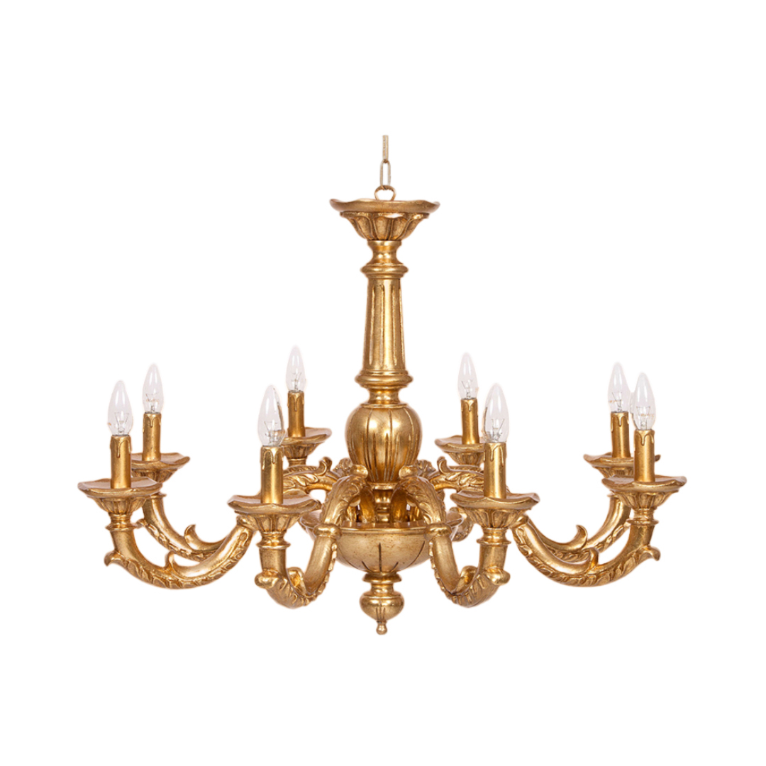Lampadario realizzato a mano dai nostri mastri artigiani seguendo le più antiche tradizioni del legno. Struttura in legno intarsiato color oro.. Monta 8 lampadine E14 (non inclusa) . Adatto ad un arredamento classico e raffinato