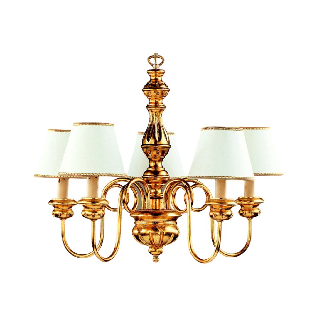 Lampadario realizzato a mano dai nostri mastri artigiani seguendo le più antiche tradizioni del legno. Struttura in legno intarsiato color oro.. Monta 5 lampadine E14 (non inclusa) . Adatto ad un arredamento classico e raffinato