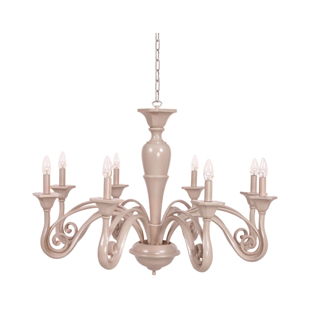Lampadario realizzato a mano dai nostri mastri artigiani seguendo le più antiche tradizioni del legno. Struttura in legno intarsiato color tortora opaco.. Monta 8 lampadine E14 (non inclusa) . Adatto ad un arredamento classico e raffinato