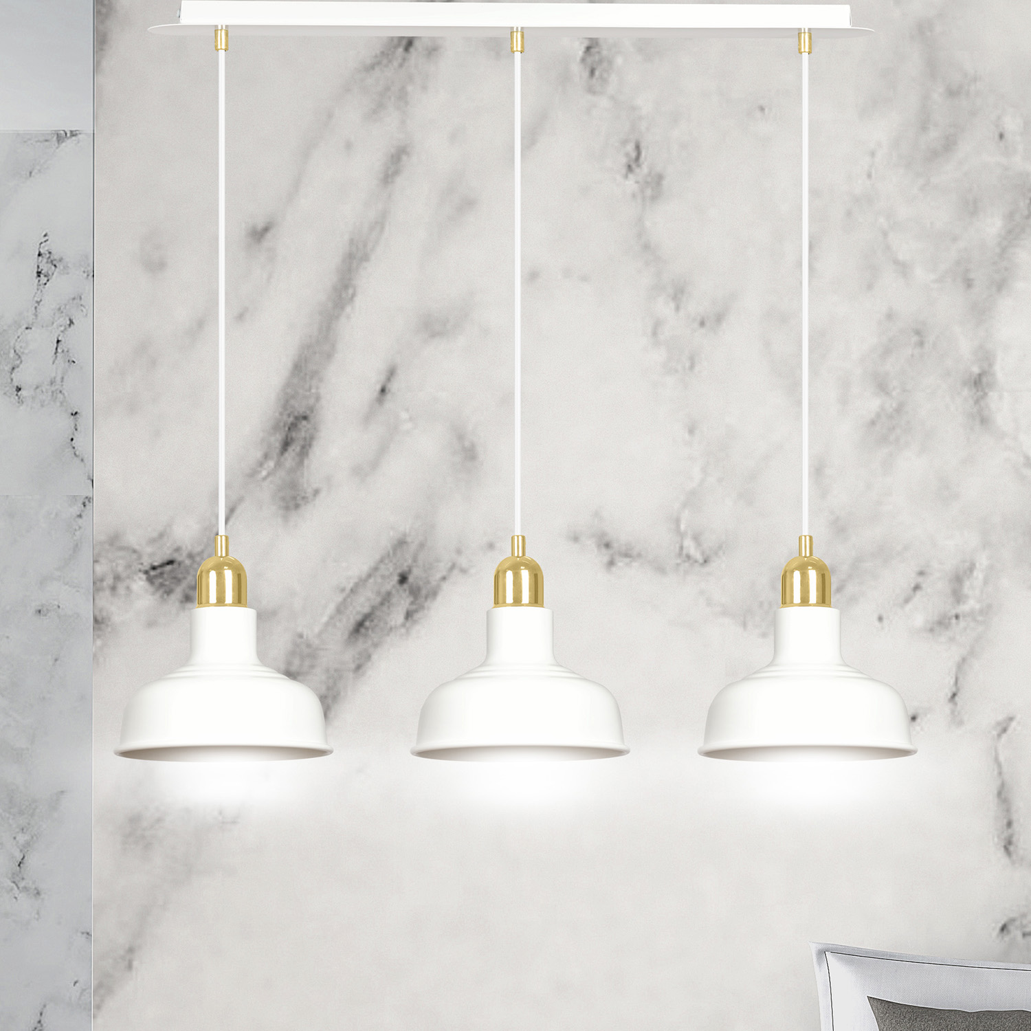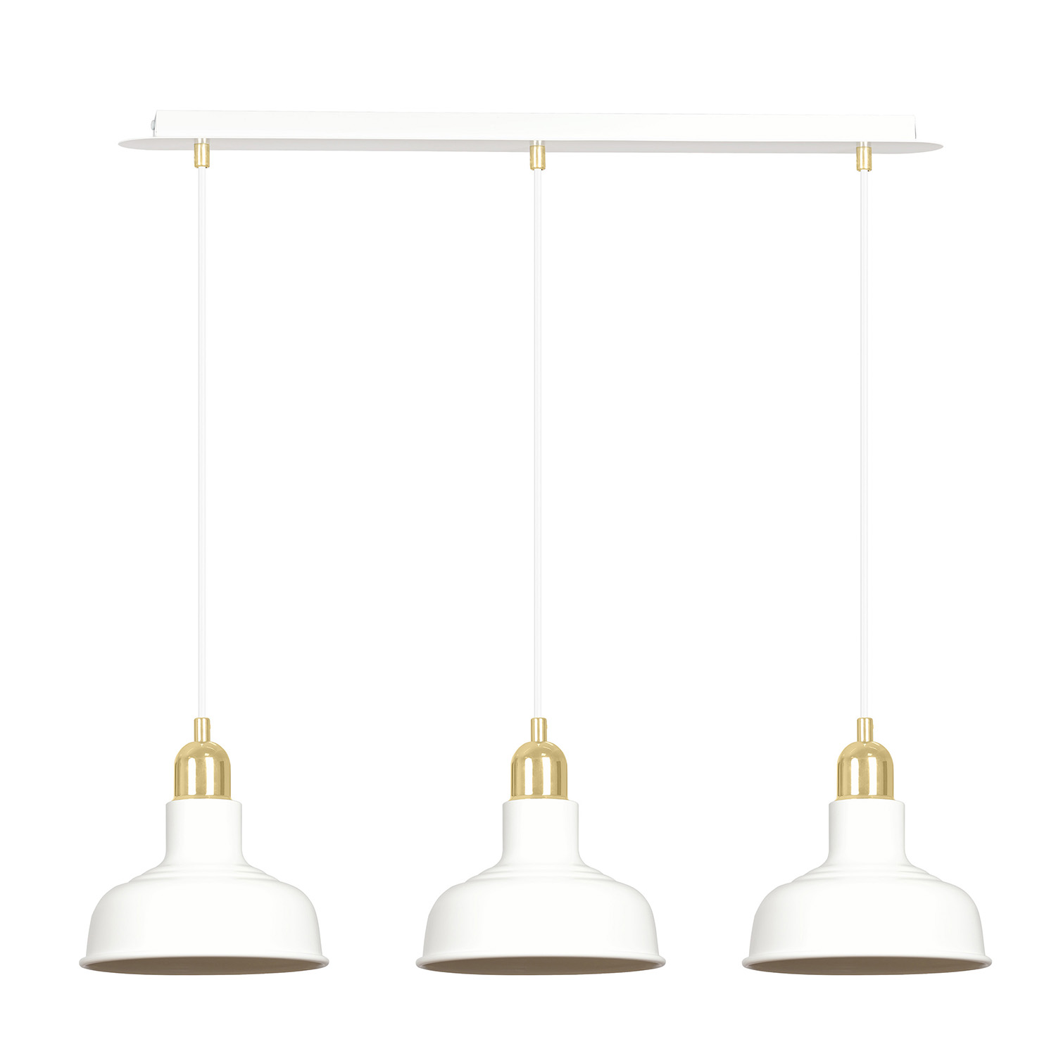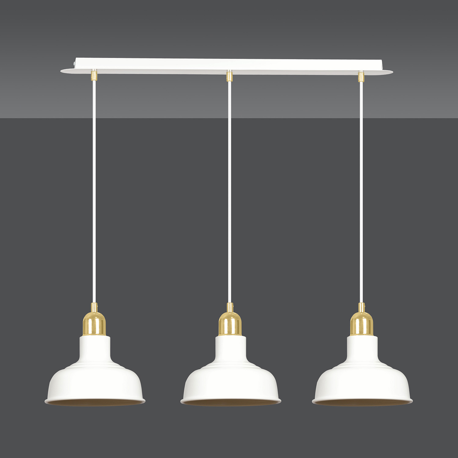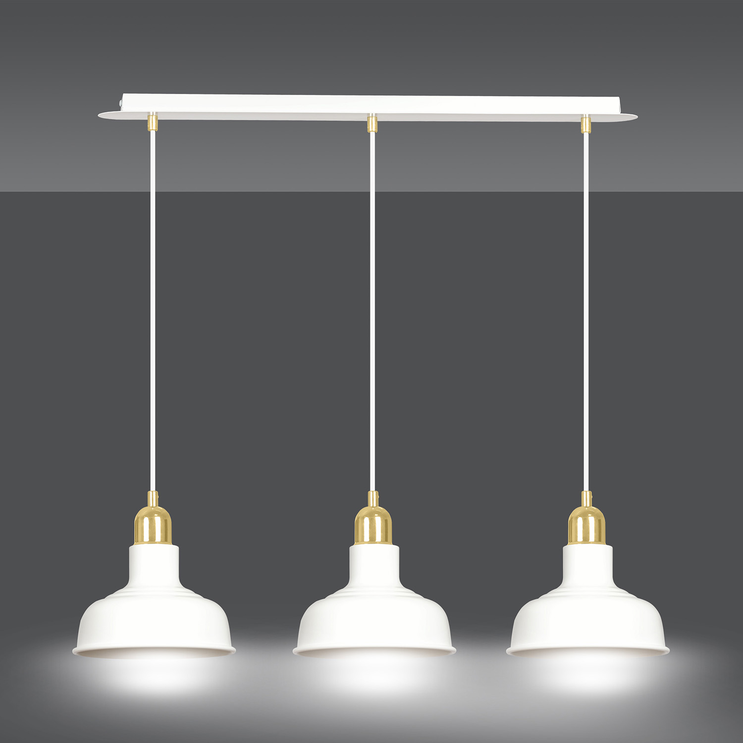 Lampadario in stile industriale realizzato con una base rettangolare in metallo e tre paralumi in metallo di colore bianco con elementi decorativi dorati. Un modello che si adatta perfettamente a quasi tutti gli arredi interni. Il loro aspetto ricorda lo stile loft molto trendy. Le lampade IBOR sono caratterizzate da paralumi metallici aperti, che consentono alla lampada di illuminare efficacemente anche ampi spazi.