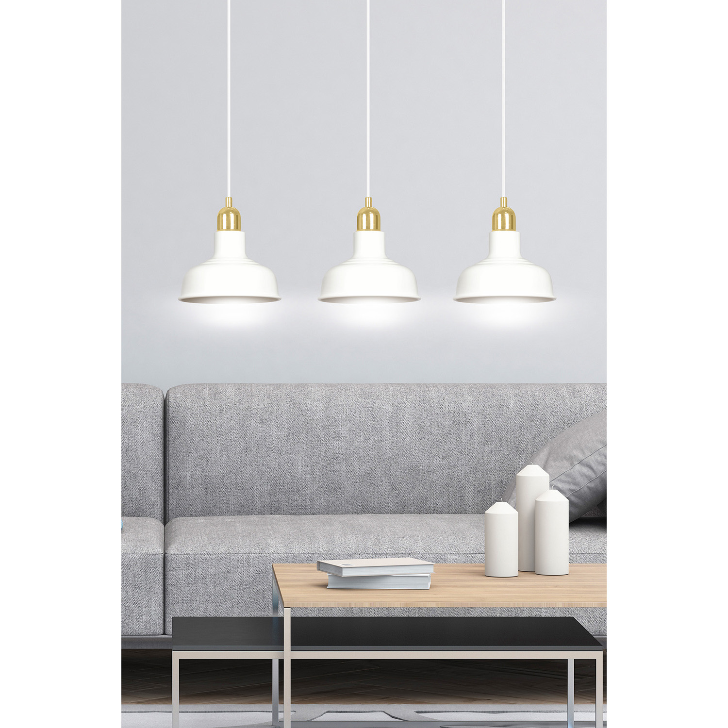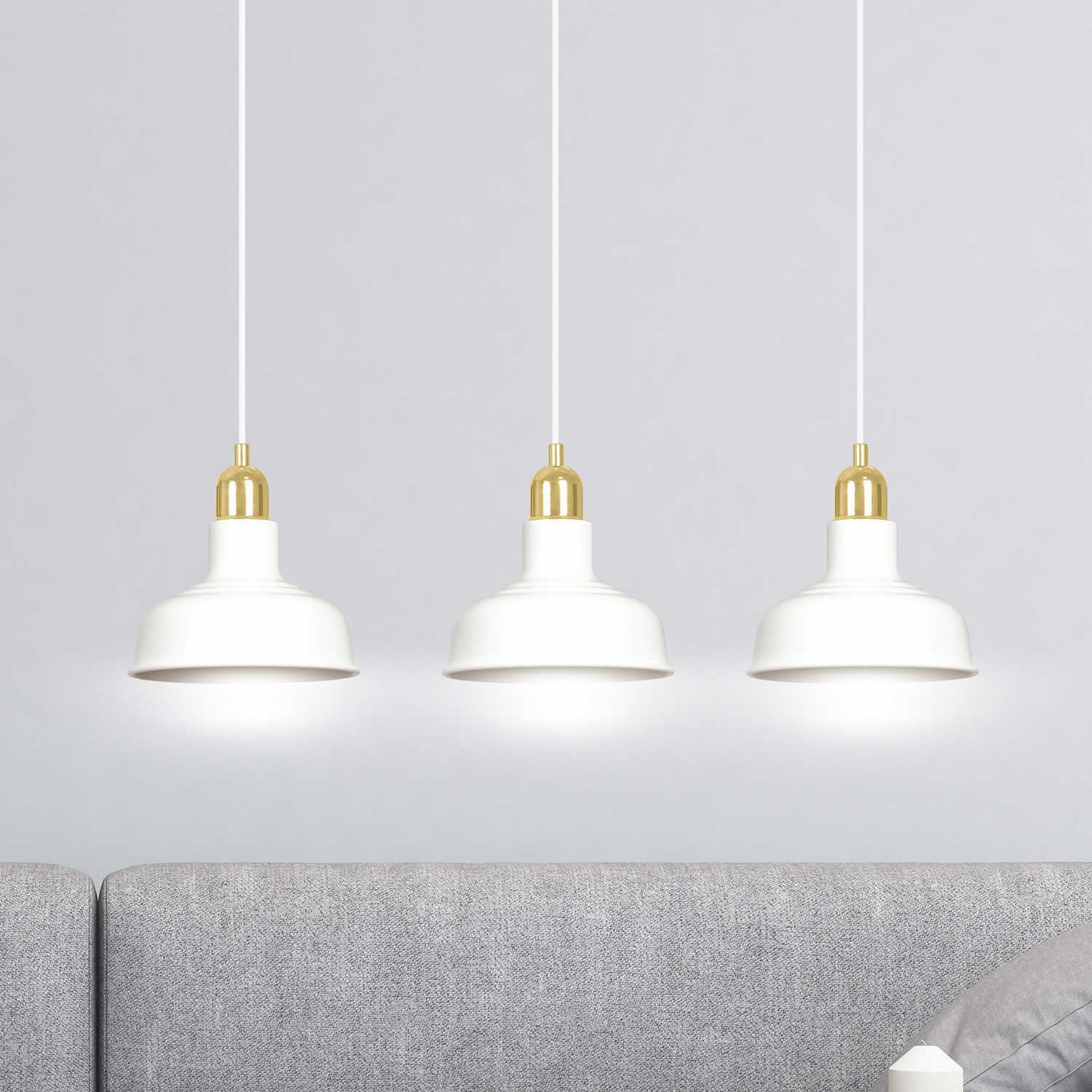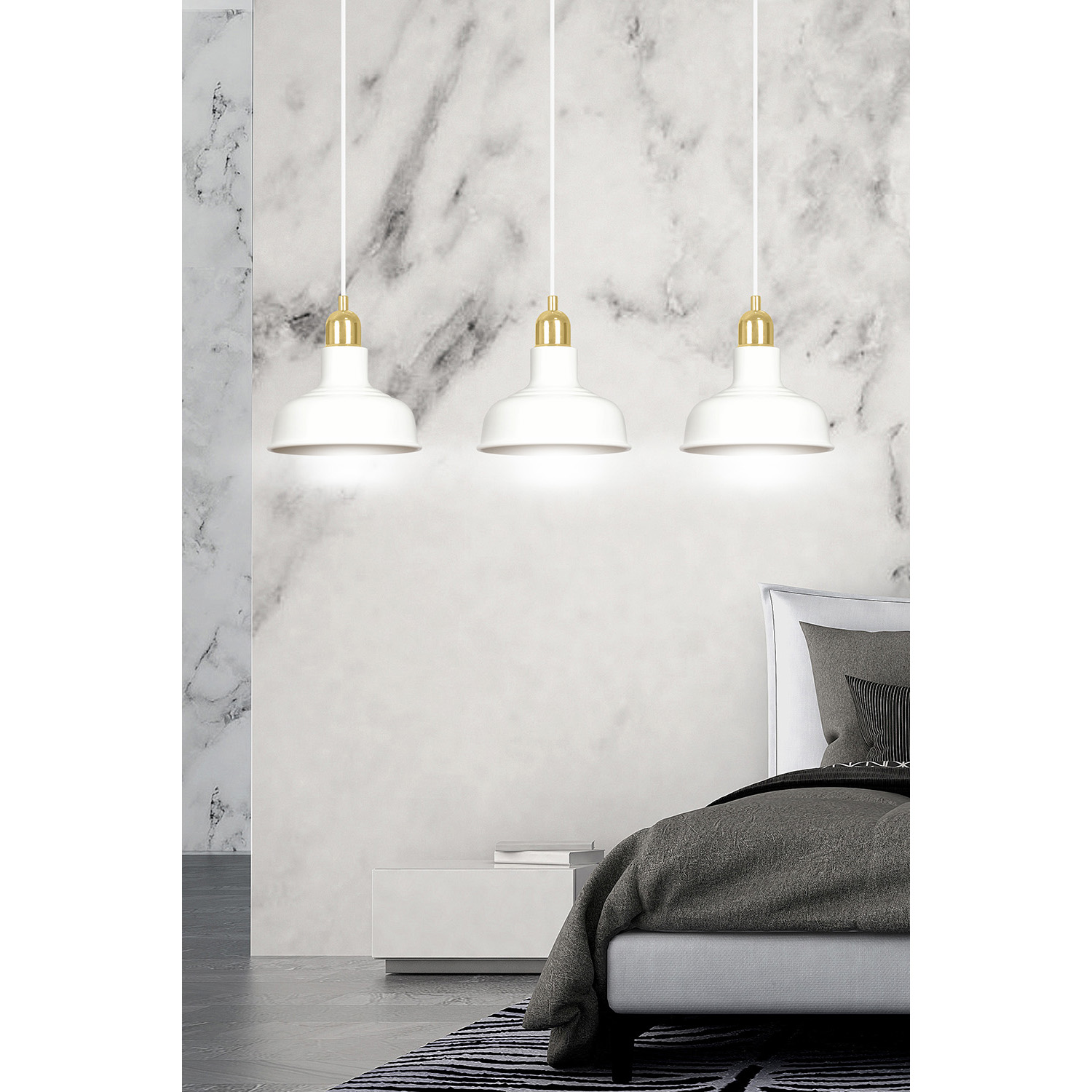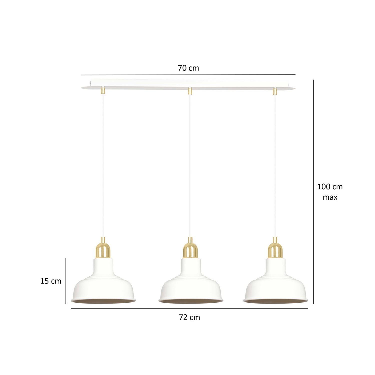 Lampadario in stile industriale realizzato con una base rettangolare in metallo e tre paralumi in metallo di colore bianco con elementi decorativi dorati. Un modello che si adatta perfettamente a quasi tutti gli arredi interni. Il loro aspetto ricorda lo stile loft molto trendy. Le lampade IBOR sono caratterizzate da paralumi metallici aperti, che consentono alla lampada di illuminare efficacemente anche ampi spazi.