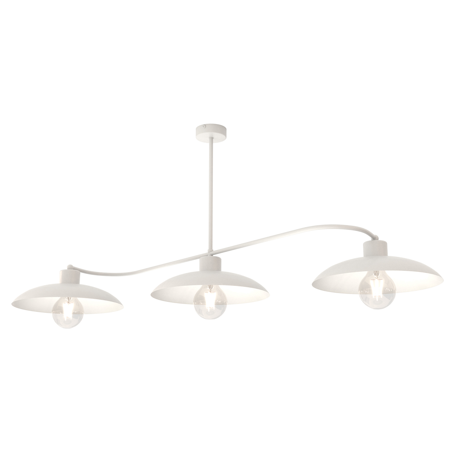 Lampadario stile industriale 3 luci in acciaio bianco con base tonda e tre diffusori a cupola. La struttura è realizzata interamente in acciaio nero, conferendo al prodotto un aspetto elegante e resistente, ideale sia per interni dal look industriale che per ambienti più contemporanei e minimalisti. I diffusori focalizzano la luce verso il basso, creando un'illuminazione funzionale e accogliente; ciò rende il lampadario adatto per l'illuminazione di superfici come tavoli da pranzo, banconi da cucina, o isole centrali, dove un'illuminazione diretta e ben distribuita