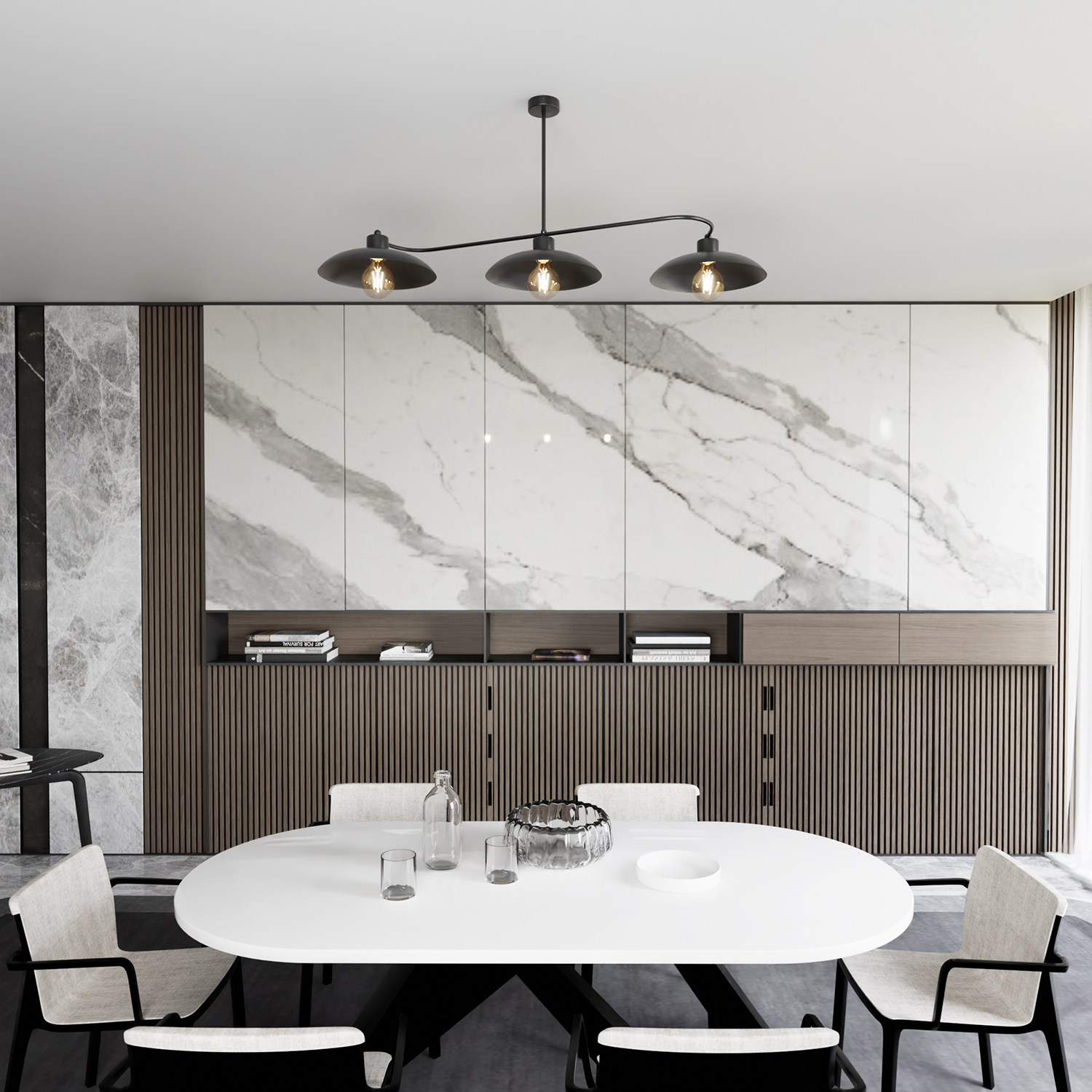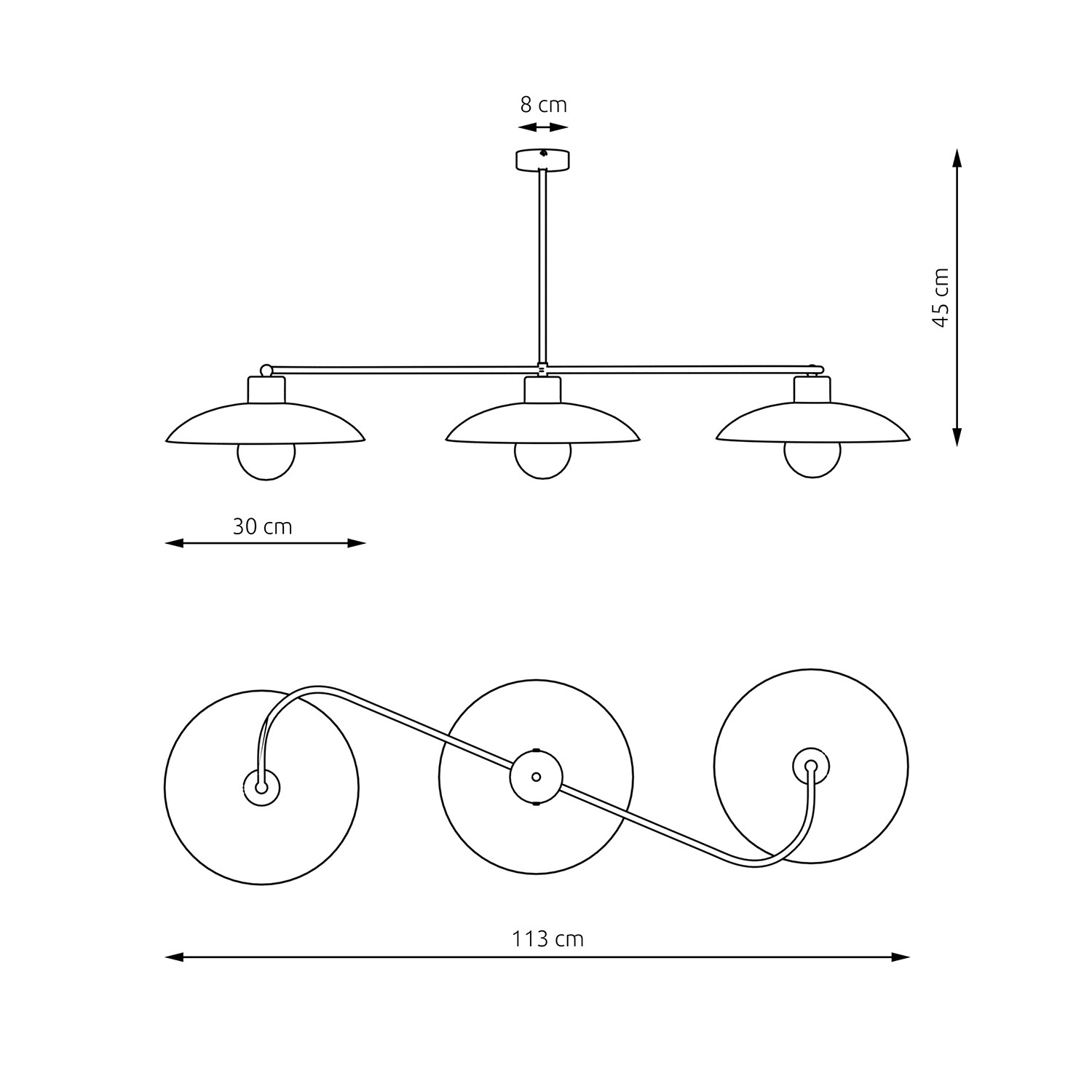 Lampadario stile industriale 3 luci in acciaio nero con base tonda e tre diffusori a cupola. La struttura è realizzata interamente in acciaio nero, conferendo al prodotto un aspetto elegante e resistente, ideale sia per interni dal look industriale che per ambienti più contemporanei e minimalisti. I diffusori focalizzano la luce verso il basso, creando un'illuminazione funzionale e accogliente; ciò rende il lampadario adatto per l'illuminazione di superfici come tavoli da pranzo, banconi da cucina, o isole centrali, dove un'illuminazione diretta e ben distribuita