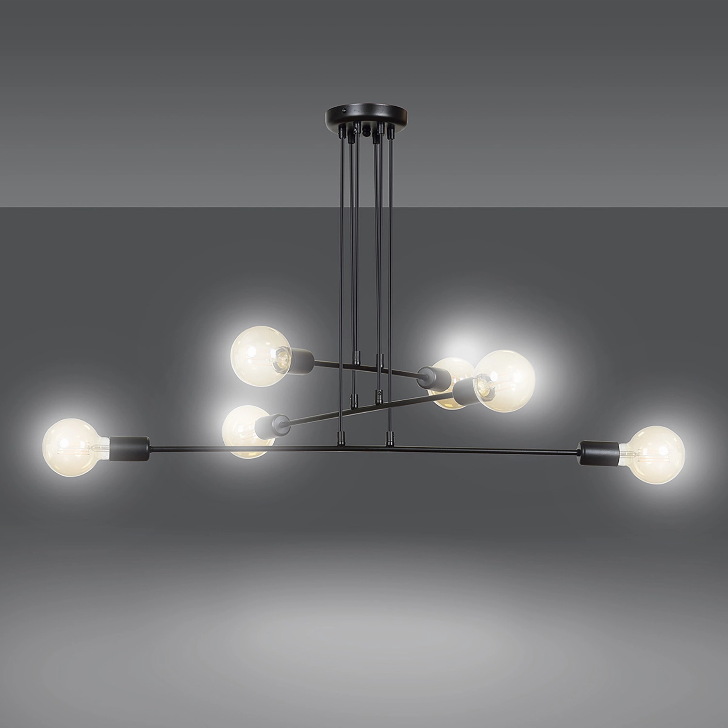 Lampadario industrial a 6 luci realizzato con una base rotonda in acciaio nero con bracci dritti in metallo appesi a cavi e sei portalampada con attacco E28. La sua forma minimalista ed espansiva gli conferisce un carattere unico e catturerà sicuramente l'attenzione di tutti gli ospiti. L'ampia struttura della lampada MULTIPO fornisce un'illuminazione perfetta per la stanza, creando un'atmosfera industriale alla moda.