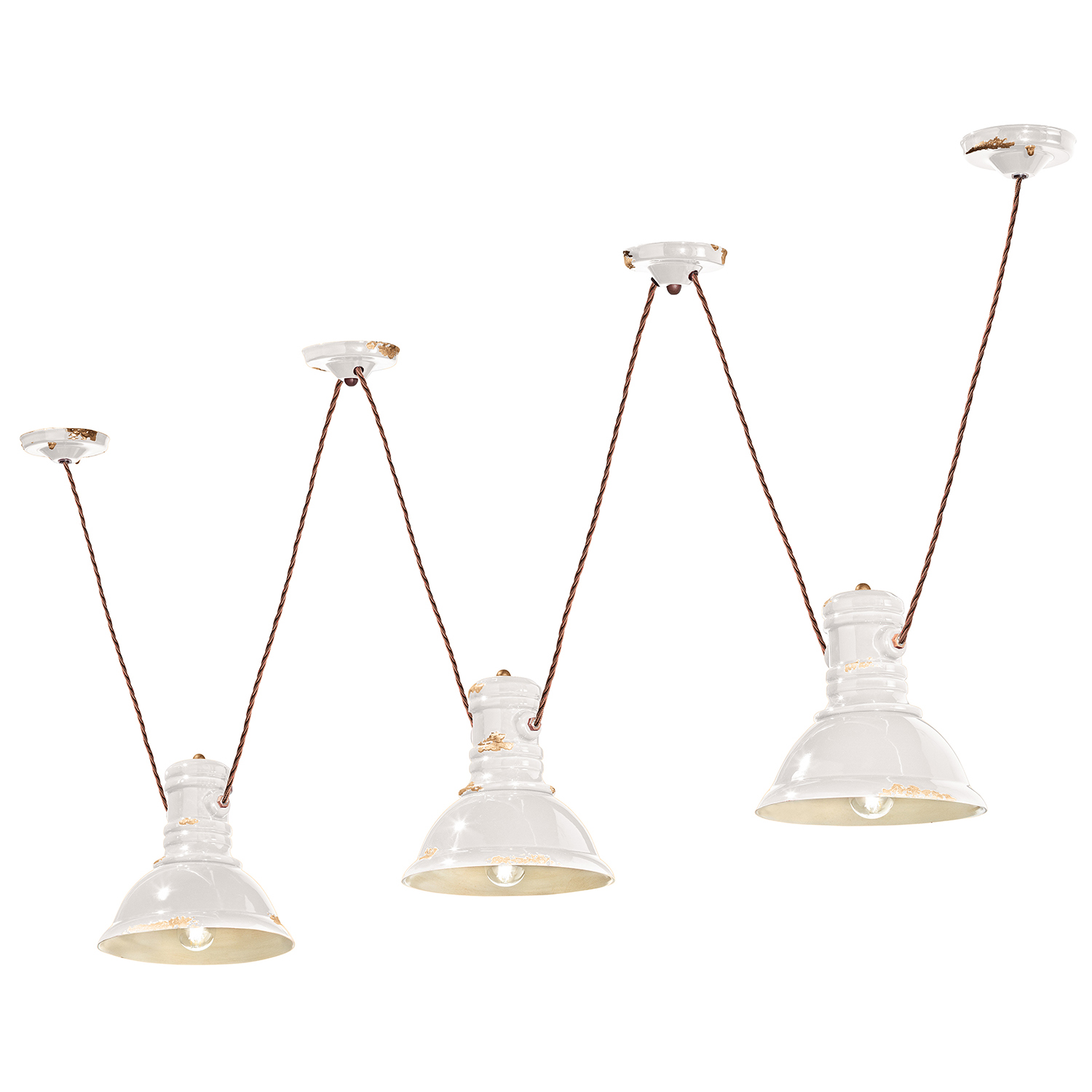 Sospensione 3 Luci diam.23 cm in ceramica con finitura vintage bianco scrupolosamente lavorata a mano da artigiani specializzati.. Un'applique che ricorda i grossi fari utilizzati per l'illuminazione delle vecchie fabbriche, a rimarcare lo stile industriale e minimalista che punta tutto sui colori accesi, le superfici lucide ed i segni del tempo che passa, come una finta erosione e le viti arrugginite. Da abbinare alle sospensioni della stessa linea a completamento di una sala da pranzo o un corridoio in stile Industrial o Vintage. Questo articolo è realizzato interamente a mano ed è disponibile anche in altre finiture, come da foto campione. Per richiedere una composizione diversa è possibile indicarlo nell'apposito campo NOTE presente in conclusione di ordine indicando il codice della finitura oppure contattarci dopo aver effettuato l'ordine. Essendo un prodotto 100% artigianale, stai acquistando un prodotto unico e per tanto può differire leggermente dalla foto.