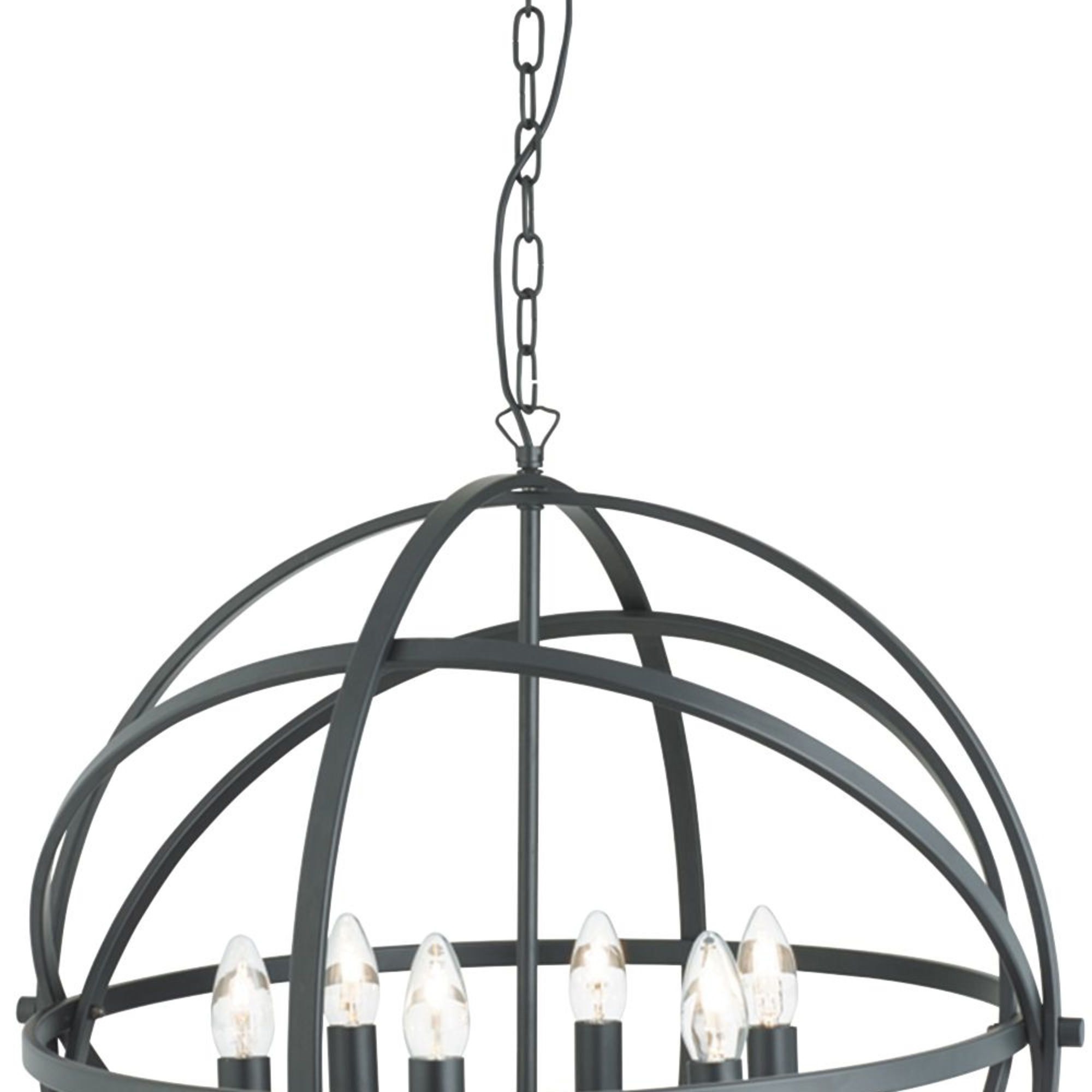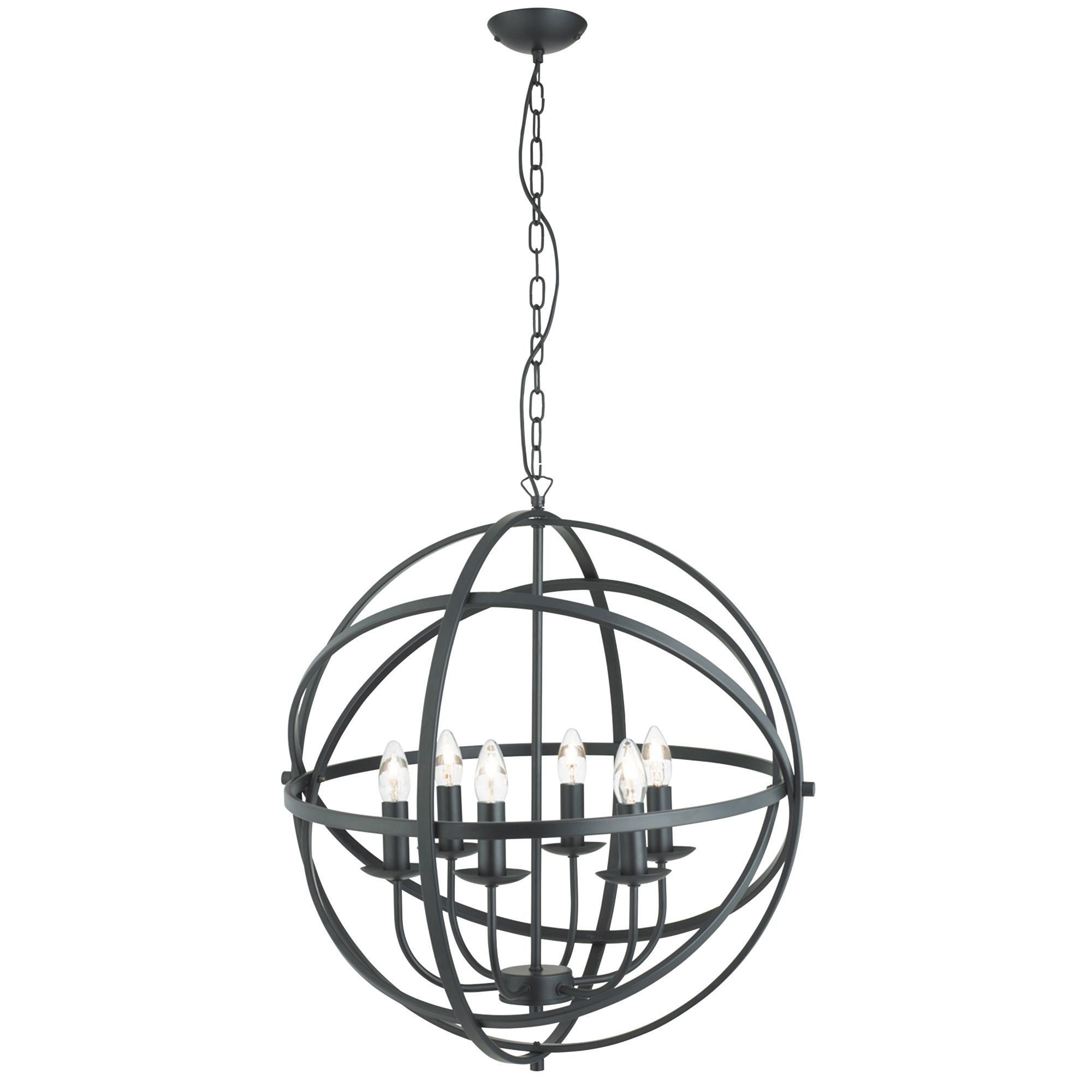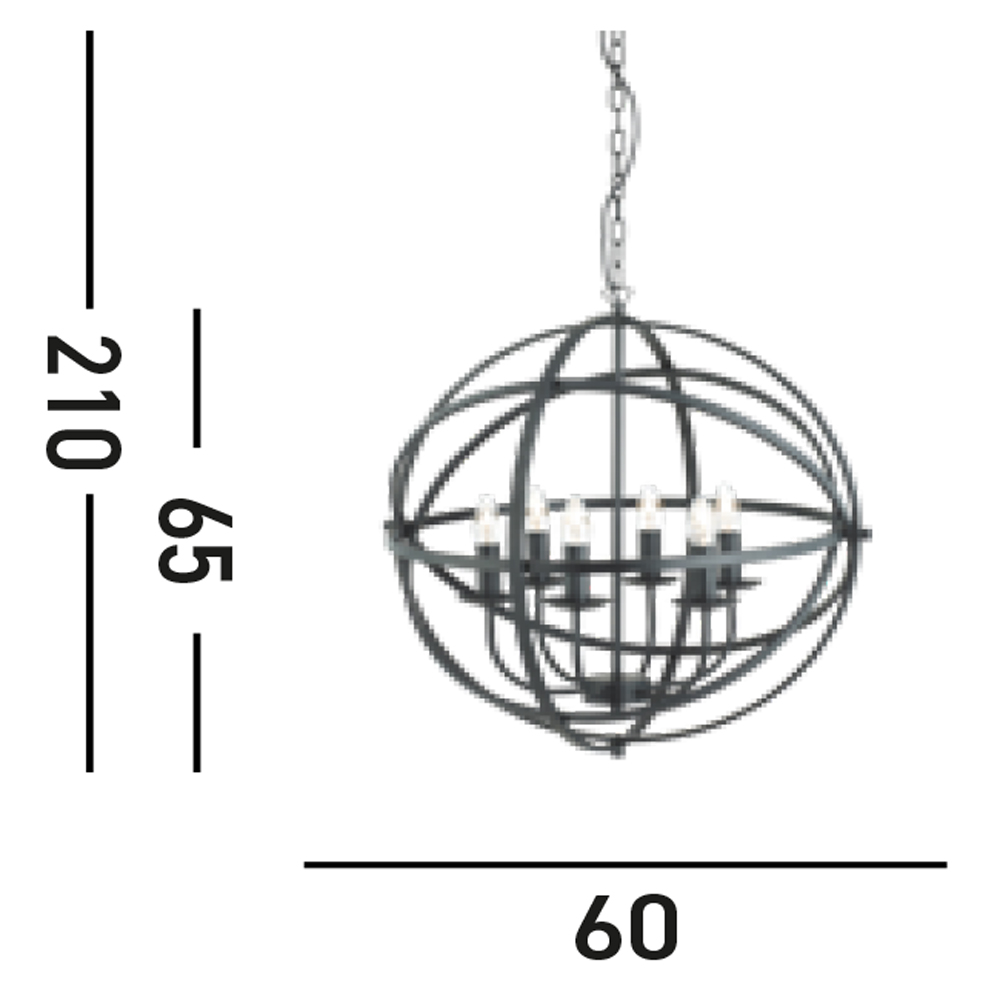Collezione OrbitaINCROCIO DI ANELLIQuesta lampada a sospensione Orbit nera opaca con 6 candele è difficile da non notare. Il raccordo sferico ha uno stile bellissim..