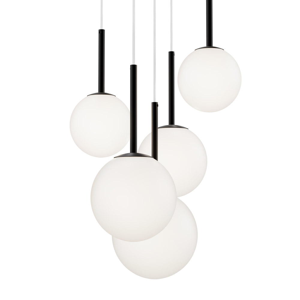 Lampadario minimalista con struttura in metallo nero che lo rende elegante e discreto. 5 luci, ognuna dotata di un diffusore in vetro bianco opaco. Con le sue cinque luci dotate di diffusori bianchi in vetro opaco, questo lampadario fornisce una luce uniforme e morbida che si diffonde in tutta la stanza. Il design minimalista del lampadario si basa su forme universali e semplici, che si adattano a qualsiasi ambiente. Il lampadario utilizza lampadine con attacco E14, facilmente reperibili in commercio e disponibili in diverse potenze e colori. Inoltre, i diffusori tondi in vetro bianco opaco sono facili da pulire e mantengono la luce uniforme nel tempo, garantendo una lunga durata al lampadario.