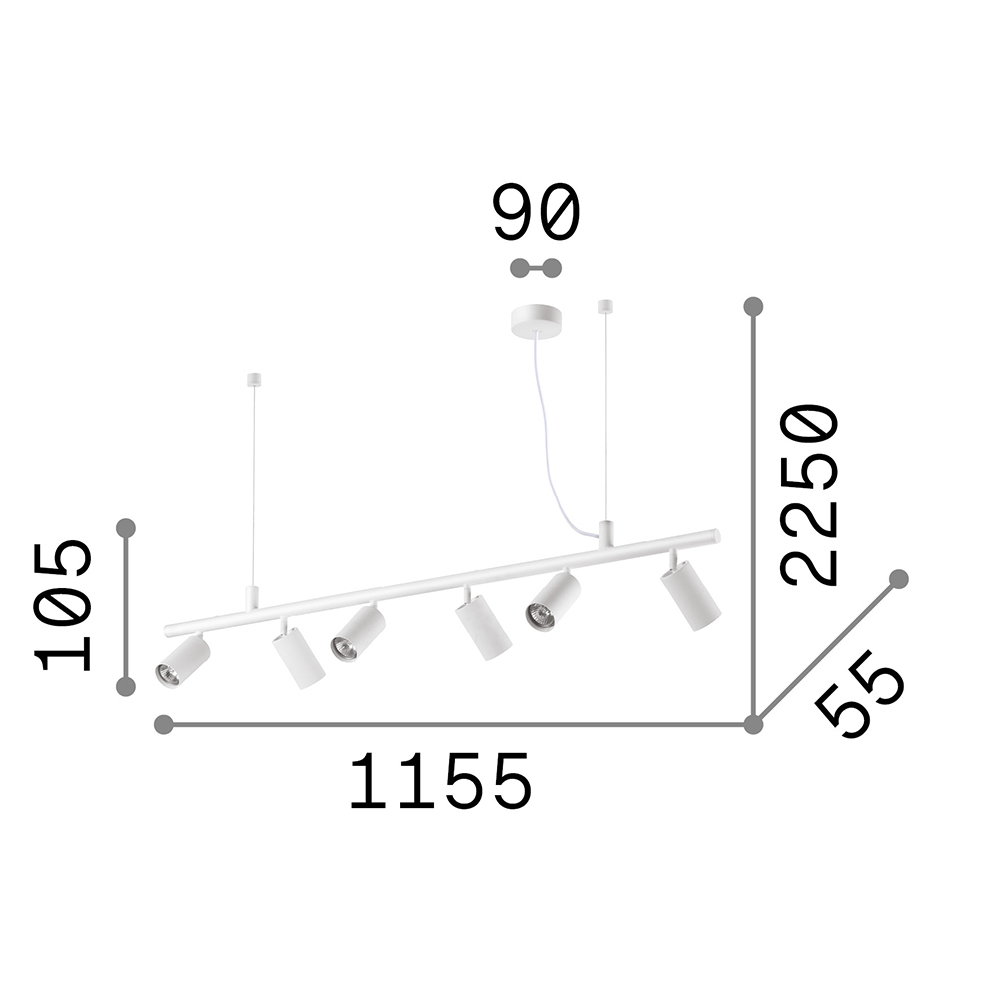 Plafoniera 6 luci Led GU10. Montatura in metallo rifinito con vernice a polveri o placcato e spazzolato. Diffusori orientabili. Cavo elettrico in tessuto.. Sospensioni con incluso kit per installazione anche a plafone. Versione bianca, luce calda 3000 K.