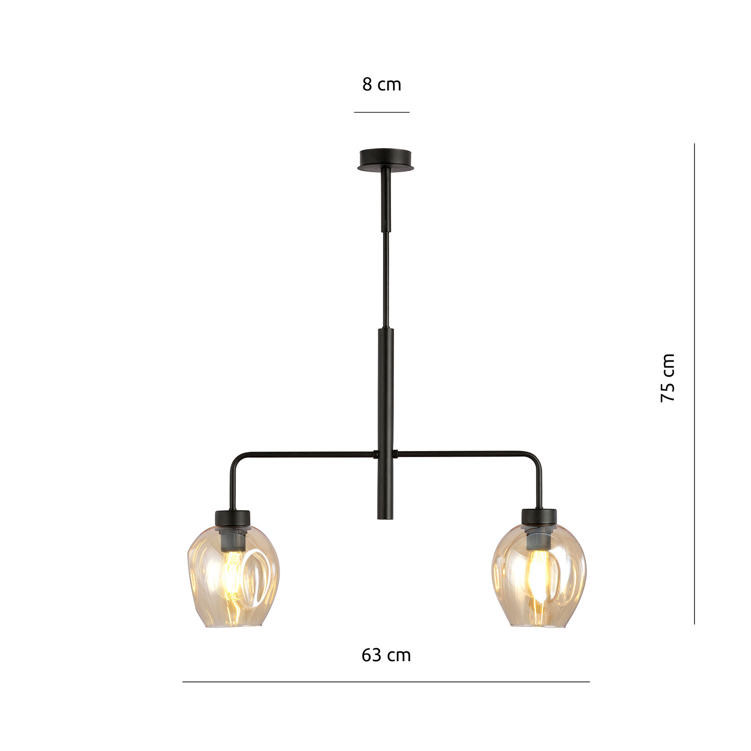 Elegante lampadario 2 luci realizzato con base e bracci in metallo di colore nero con due paralumi ovali in vetro di colore ambra. Tuttavia, funzioneranno bene anche negli spazi più tradizionali. I paralumi in vetro aggiungono eleganza e leggerezza alla serie LUKKA. Le lampade minimaliste LUKKA illuminano con efficacia anche aree di grandi dimensioni e si integrano perfettamente nella maggior parte degli arrangiamenti domestici. Il loro design originale attira l'attenzione e si presenta in modo molto elegante.