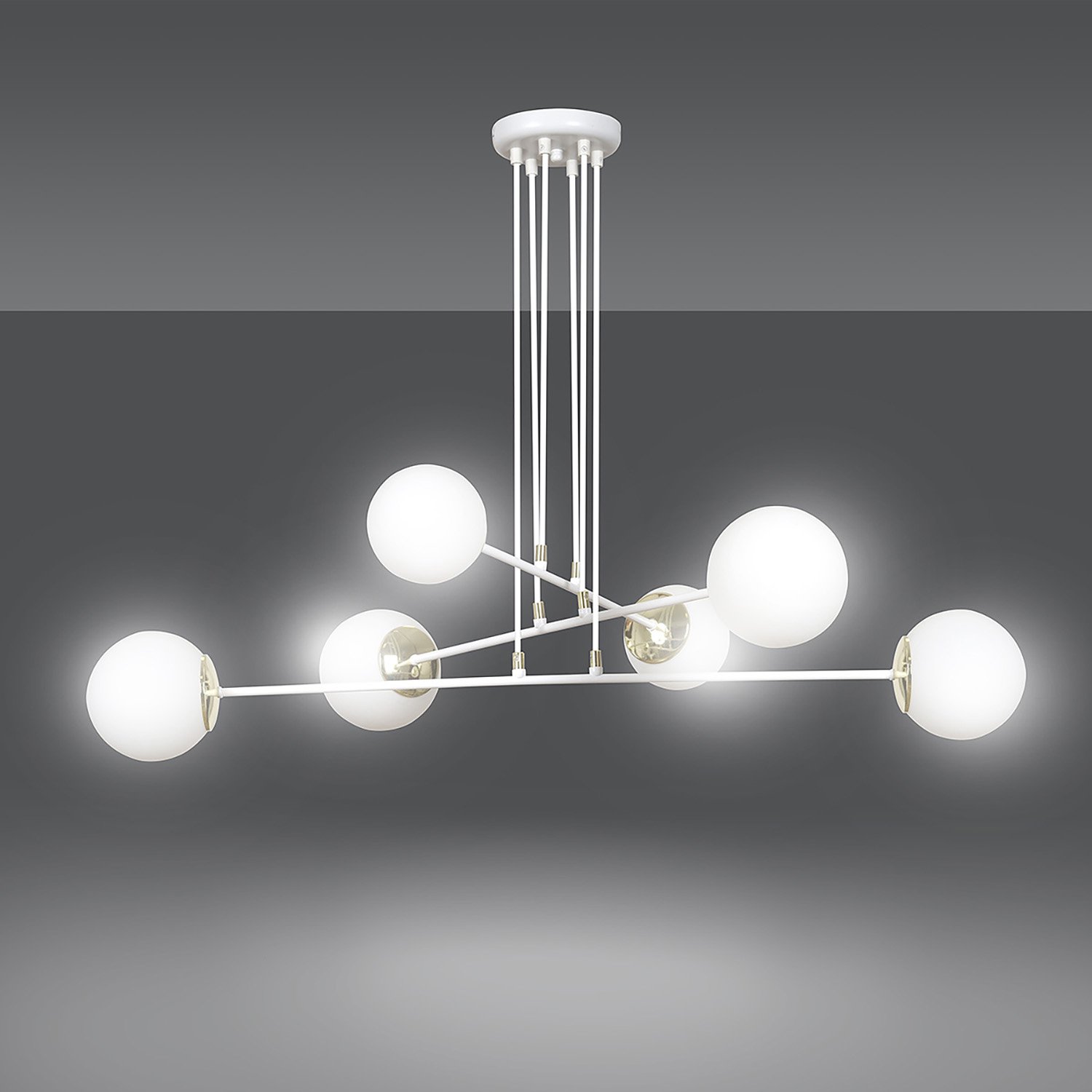 Lampadario a 6 luci con base tonda in acciaio bianco, bracci dritti e 6 paralumi a sfera in vetro di colore opale con dettagli decorativi in metallo oro. Gli elementi dorati aggiungono un bagliore elegante e l'aspetto generale è leggero e aggraziato. Grazie ai suoi cavi lunghi, la lampada funziona bene in spazi dal soffitto alto.