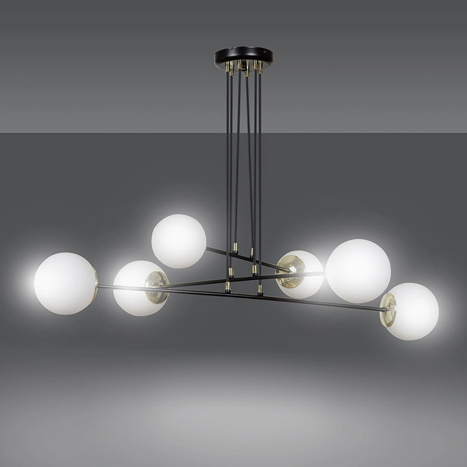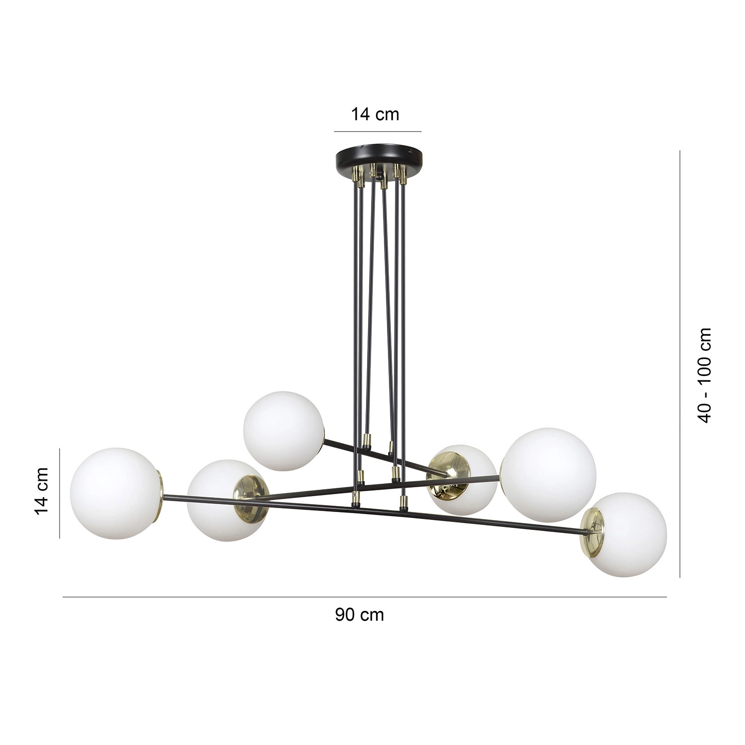 Lampadario a 6 luci con base tonda in acciaio nero, bracci dritti e 6 paralumi a sfera in vetro di colore opale con dettagli decorativi in metallo oro. Gli elementi dorati aggiungono un bagliore elegante e l'aspetto generale è leggero e aggraziato. Grazie ai suoi cavi lunghi, la lampada funziona bene in spazi dal soffitto alto.