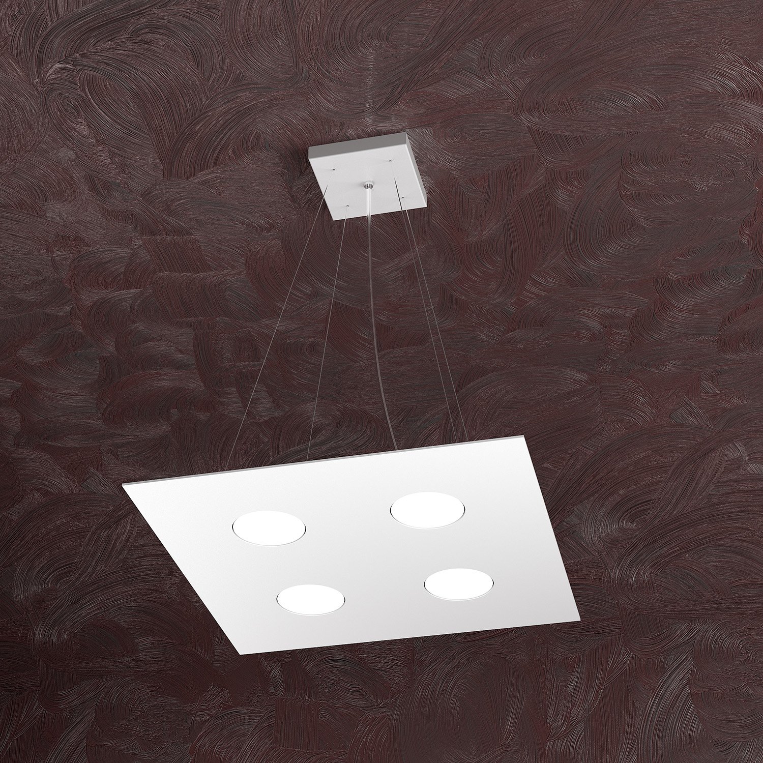 Sospensione 4 luci realizzata con lastre quadrate in metallo verniciato in finitura bianca di forma quadrata.. Il punto di forza del prodotto consiste nel non utilizzare dei led integrati ma una lampadina Gx53 che, una volta montata, arriva a filo della lastra metallica e può essere facilmente sostituita dall’esterno. Questo articolo è disponibile in diverse finiture e/o dimensioni. E' possibile indicarlo nell'apposito campo NOTE presente in conclusione di ordine oppure contattarci dopo aver effettuato l'ordine.