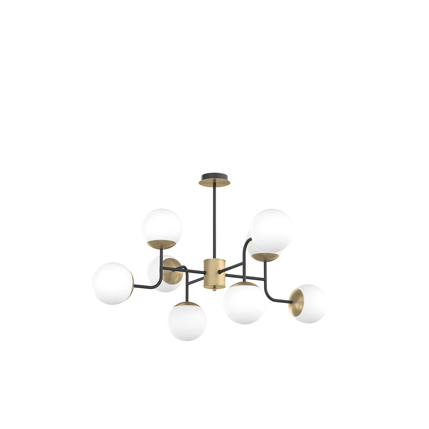 Collezione di lampade composte da strutture in metallo verniciato nero con particolari in ottone satinato e diffusori in vetro bianco soffiato e acidato opaco. I lampadari a 8 e 12 luci possono essere regolati in altezza mediante l'utilizzo dei tre distanziali forniti in dotazione