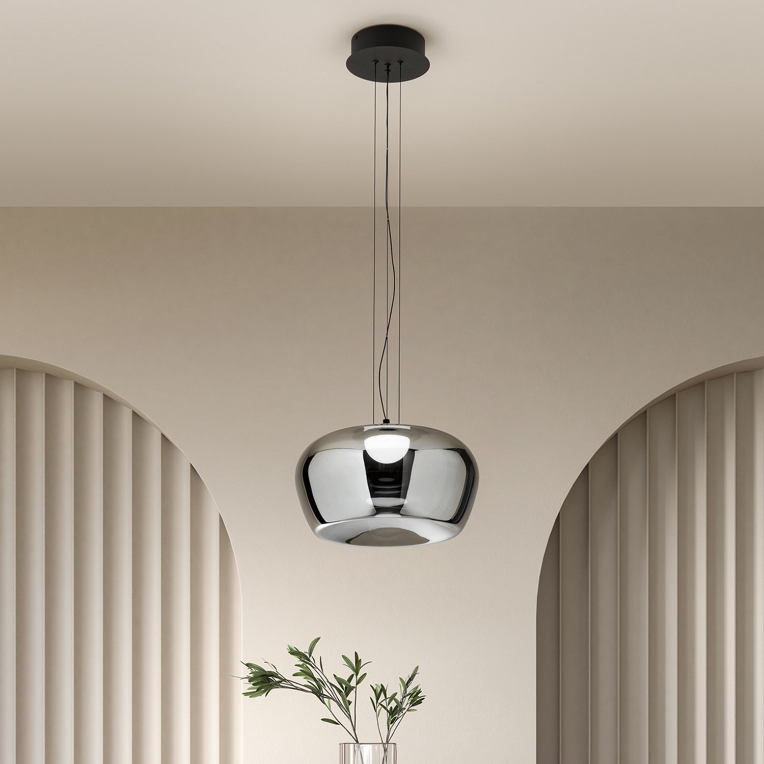 Collezione con struttura in metallo/alluminio verniciato a polvere e vetro concavo a scelta nei vari colori. Diffusore interno in acrilico bianco. Nelle sospensioni cavi supporto acciaio e cavo alimentazione in PVC. Colore: Fumè specchiato + nero opaco D.38 x H.175 cm LED 20W, DIMMERABILE 3000K CRI.80 220-240V 50/60Hz IP20 - Classe I 1600Lm lumen prodotto 2361Lm lumen sorgente 40.000h durata led