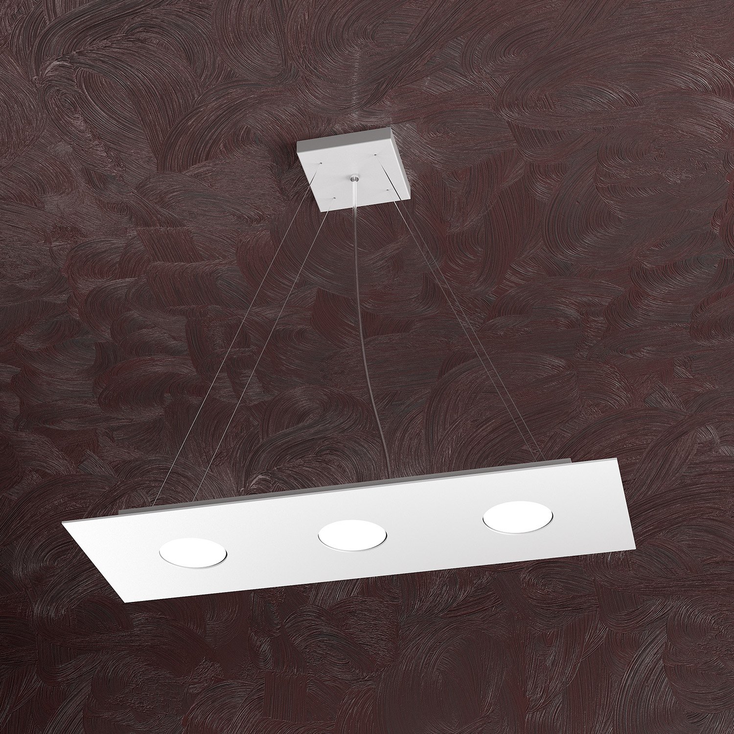 Sospensione 3 luci realizzata con lastre quadrate in metallo verniciato in finitura bianca di forma rettangolare.. Il punto di forza del prodotto consiste nel non utilizzare dei led integrati ma una lampadina Gx53 che, una volta montata, arriva a filo della lastra metallica e può essere facilmente sostituita dall’esterno. Questo articolo è disponibile in diverse finiture e/o dimensioni. E' possibile indicarlo nell'apposito campo NOTE presente in conclusione di ordine oppure contattarci dopo aver effettuato l'ordine.
