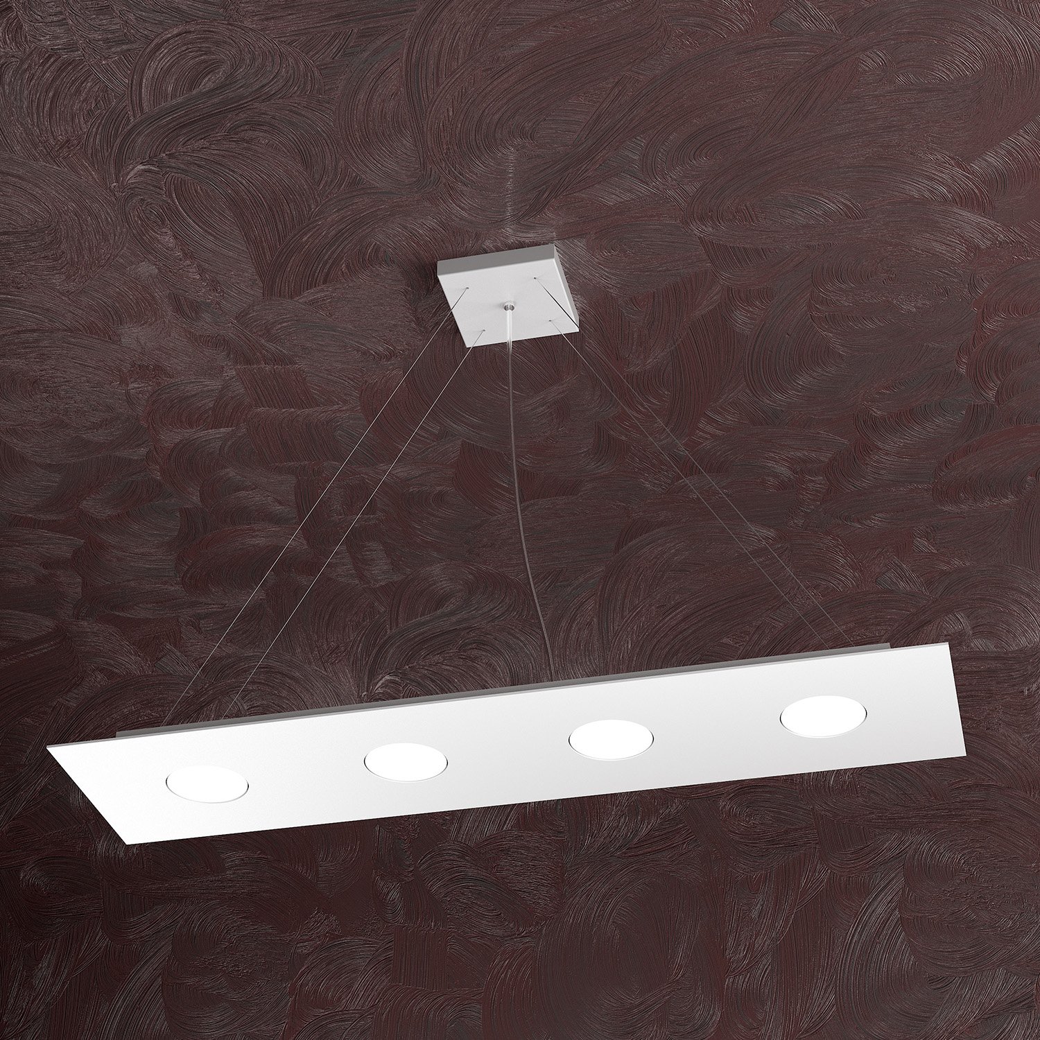 Sospensione 4 luci realizzata con lastre quadrate in metallo verniciato in finitura bianca di forma rettangolare.. Il punto di forza del prodotto consiste nel non utilizzare dei led integrati ma una lampadina Gx53 che, una volta montata, arriva a filo della lastra metallica e può essere facilmente sostituita dall’esterno. Questo articolo è disponibile in diverse finiture e/o dimensioni. E' possibile indicarlo nell'apposito campo NOTE presente in conclusione di ordine oppure contattarci dopo aver effettuato l'ordine.
