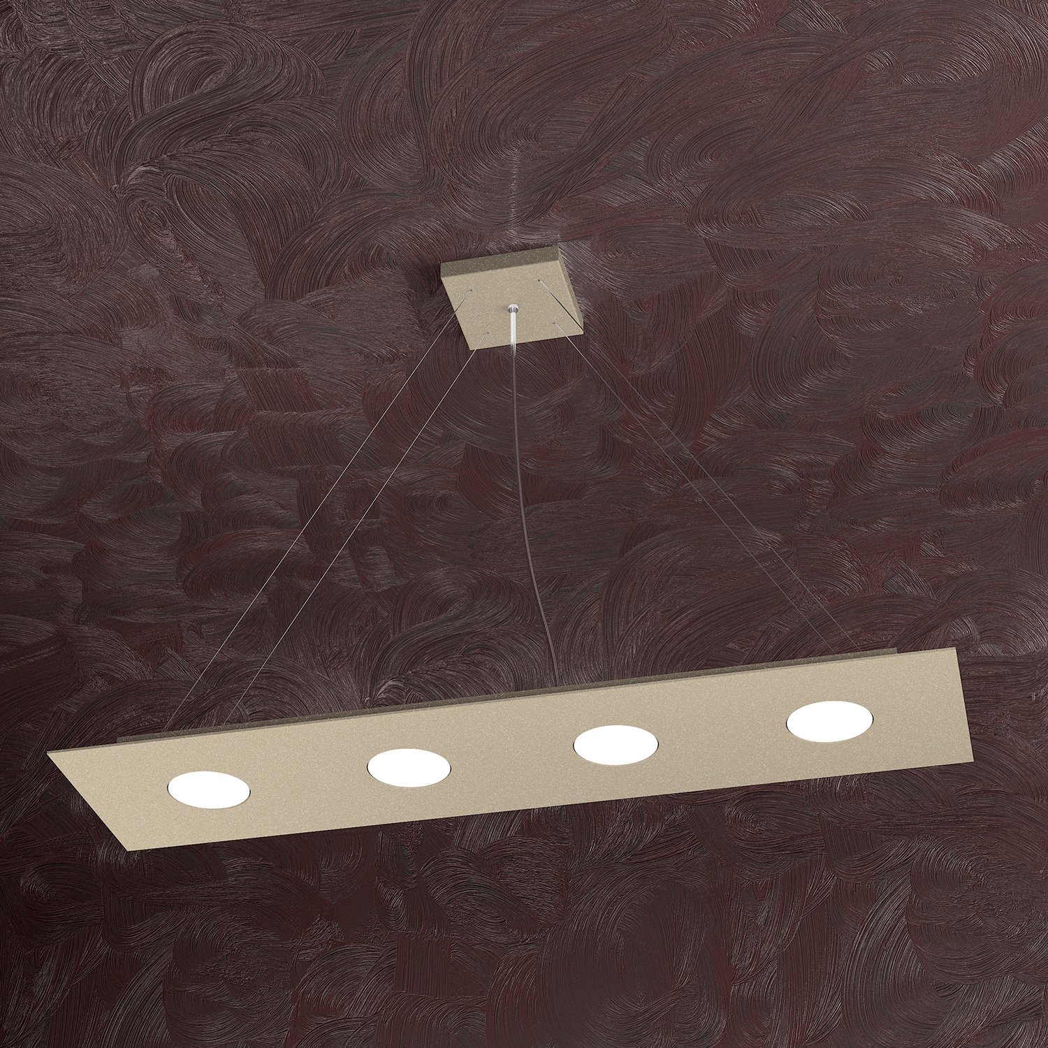 Sospensione 4 luci realizzata con lastre quadrate in metallo verniciato in finitura sabbia di forma rettangolare.. Il punto di forza del prodotto consiste nel non utilizzare dei led integrati ma una lampadina Gx53 che, una volta montata, arriva a filo della lastra metallica e può essere facilmente sostituita dall’esterno. Questo articolo è disponibile in diverse finiture e/o dimensioni. E' possibile indicarlo nell'apposito campo NOTE presente in conclusione di ordine oppure contattarci dopo aver effettuato l'ordine.