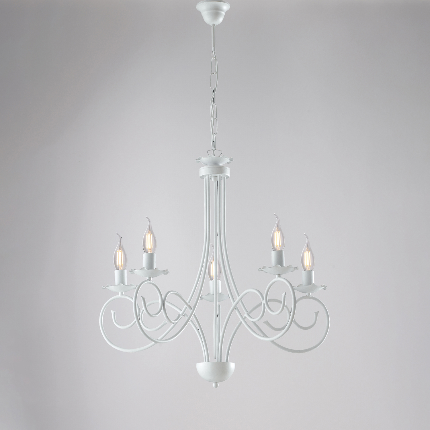 Lampadario in ferro battuto laccato bianco con decorazione effetto shabby chic a 5 braccia. . Lo stile provenzale country, color bianco shabby lo rende ideale per illuminare cucine, saloni e camere da letto. La struttura del lampadario è realizzata in ferro sagomato, con portalampada a vista effetto candela. Disponibile anche nella versione nero e rame. Realizzato interamente a mano da mastri artigiani, 100% Made in Italy.