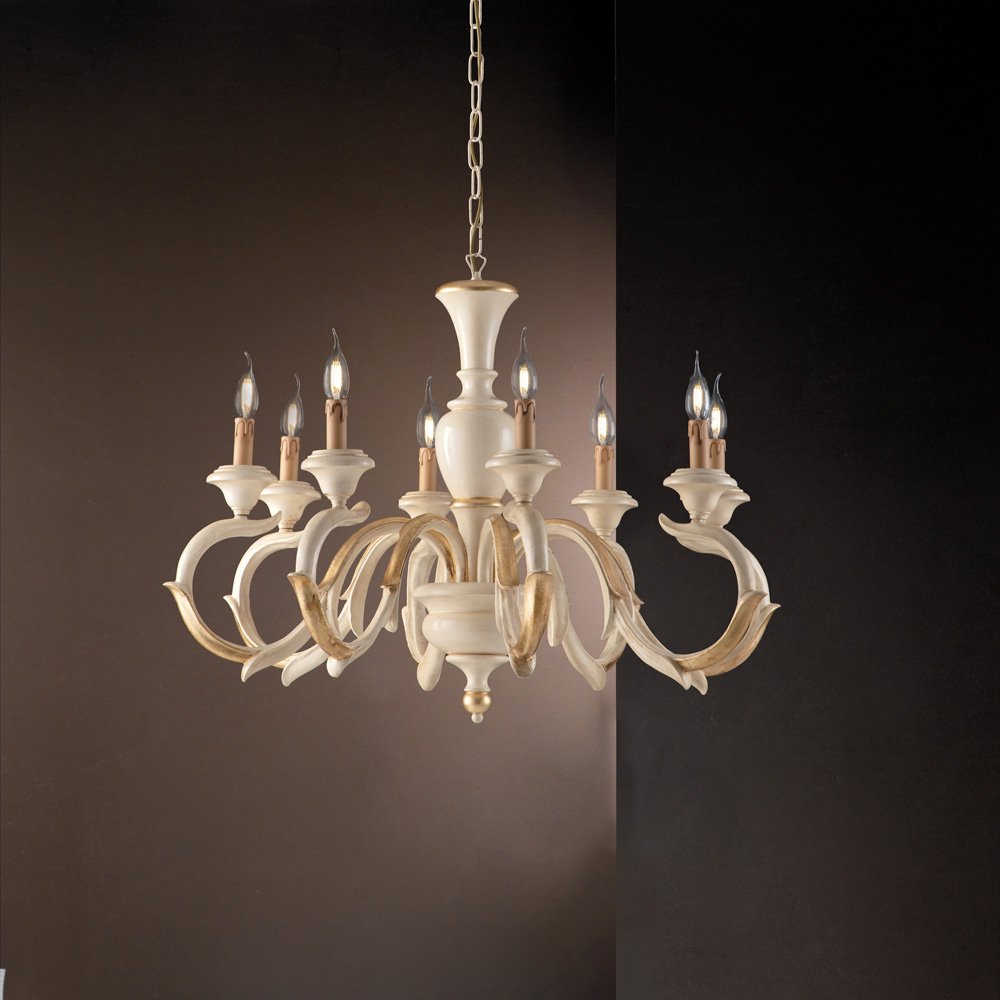 Lampadario Shabby Chic Fiorenza Legno Avorio Oro 8 Luci E14