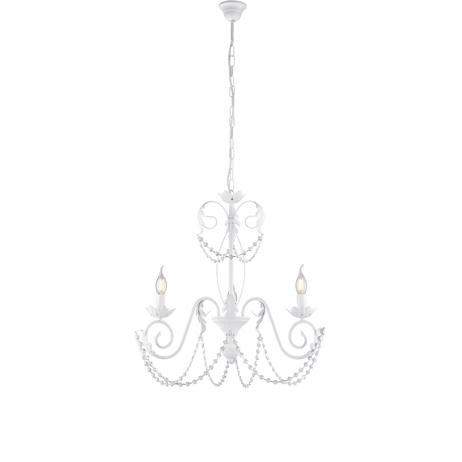 Lampadario a 3 luci in ferro laccato bianco con decorazioni effetto shabby chic. . La struttura è arricchita con catene di strass in cristallo trasparente di forma ottagonale e foglie in ferro battuto, le lampade sono a vista, mentre il portalampada è a effetto candela. Elegante e maestoso, questo lampadario risulta adatto ad impreziosire ogni ambiente: ingressi, salotti, camere da letto, sale da pranzo, hotel, alberghi ed è realizzato interamente a mano da artigiani italiani. Disponibile anche nella versione avorio ed oro antico. Il lampadario si adatta a tutte le altezze grazie alla catena regolabile.