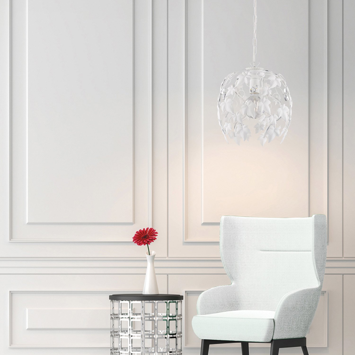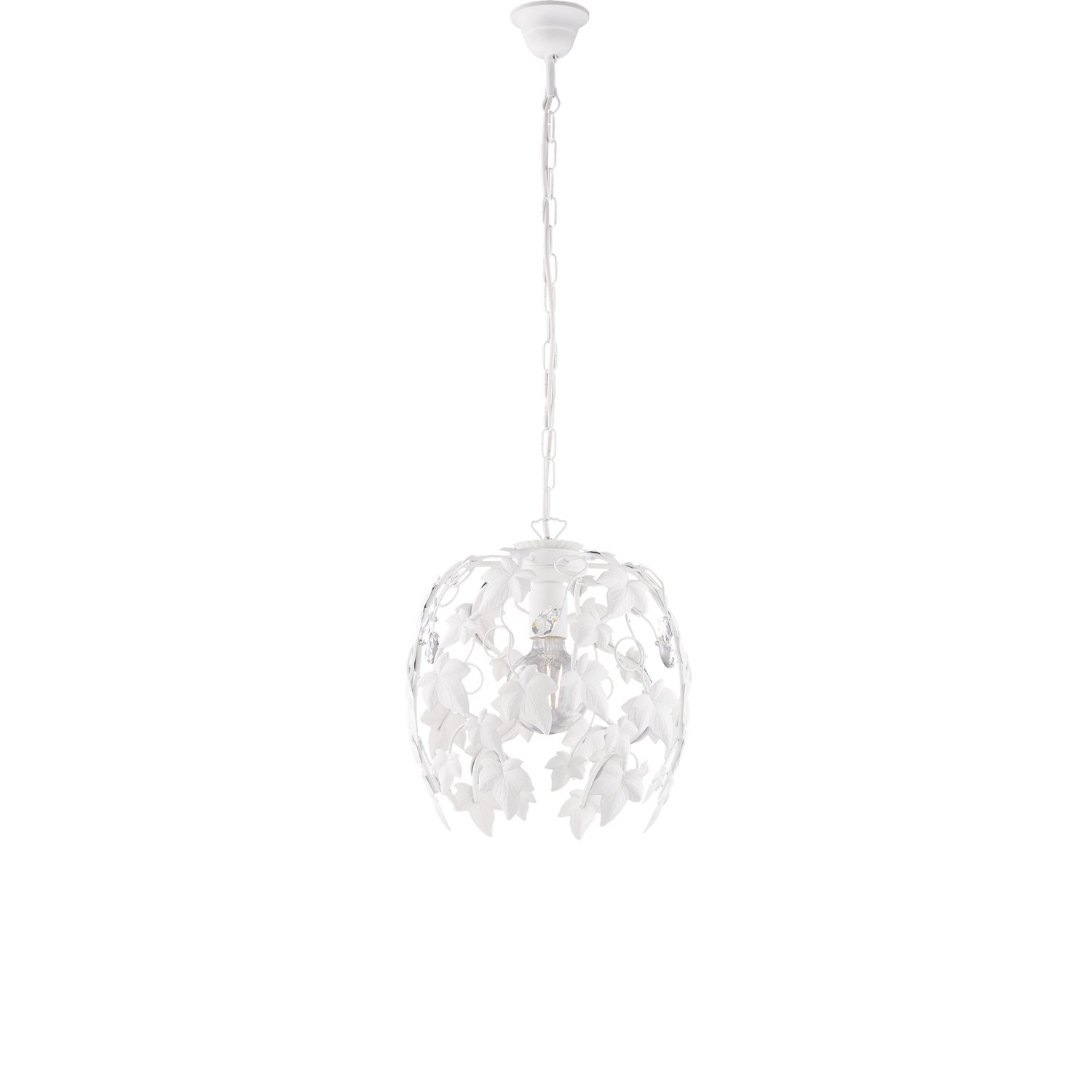 Collezione EderaDECORAZIONI FLOREALI PER IL TUO NATURAL LIVINGLampadario a sospensione in con struttura in ferro laccato bianco a 1 luce tra foglie di edera forgiate..