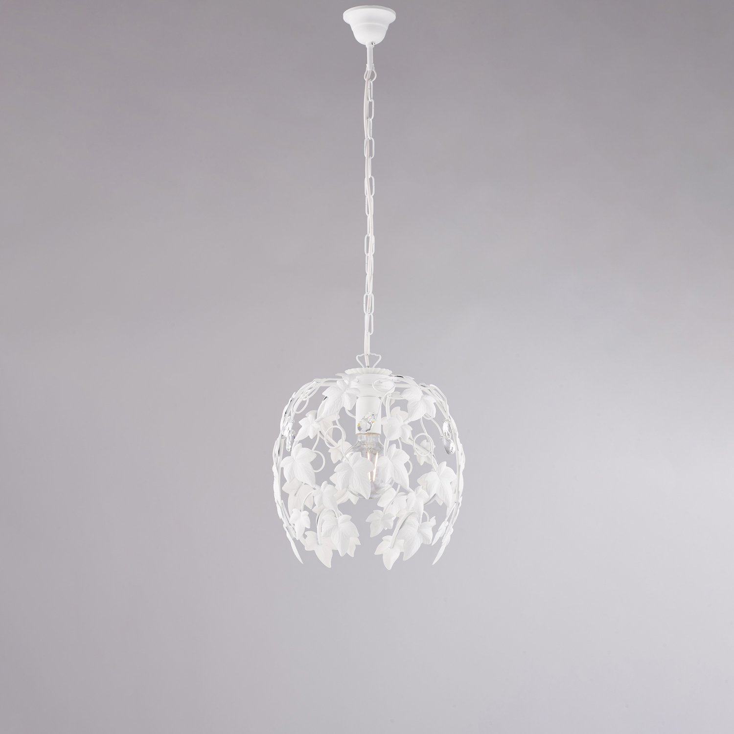 Lampadario Shabby Edera 1 Luce Ferro Battuto Bianco Con Foglie E Cristalli