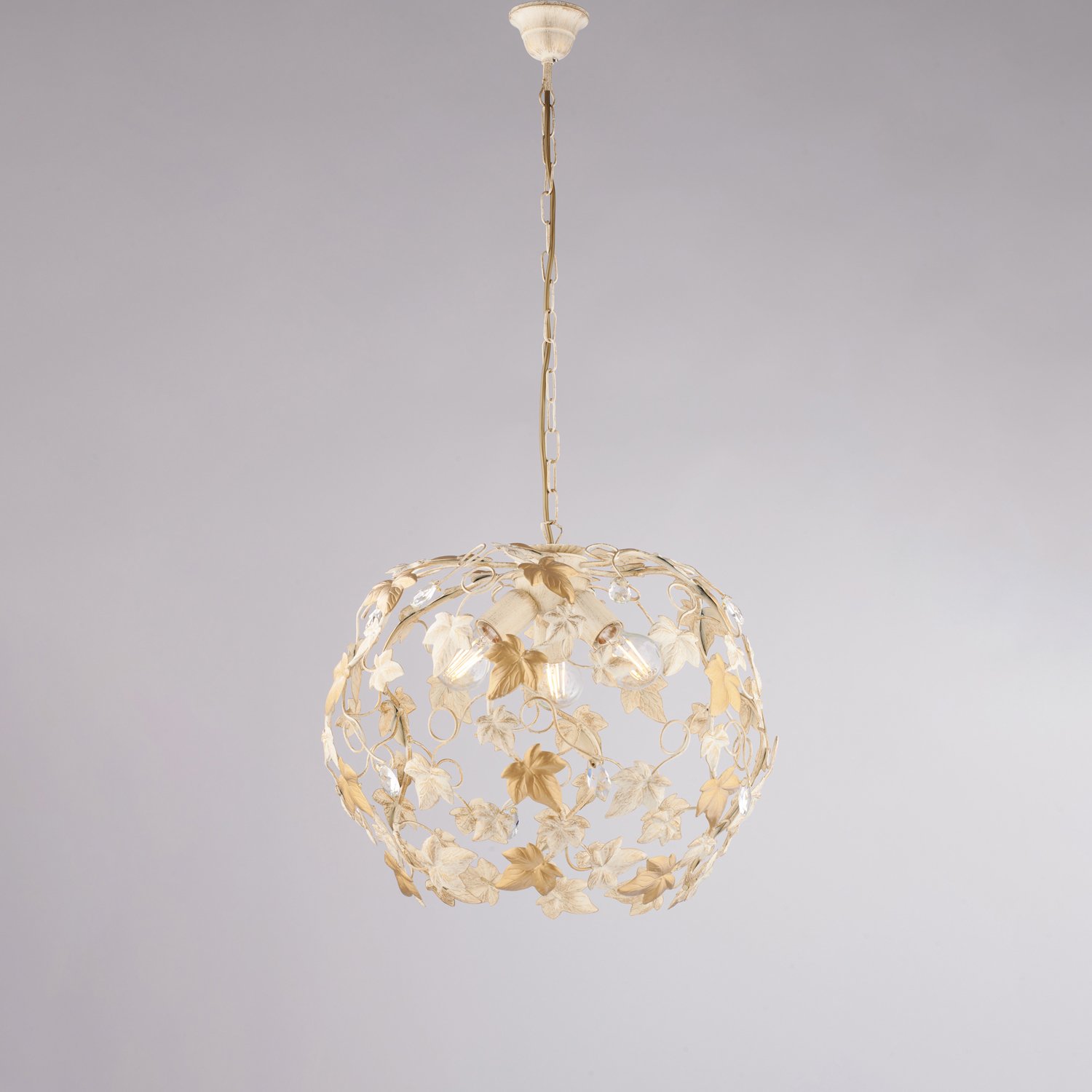 Lampadario Shabby Edera 3 Luci Ferro Battuto Avorio Oro Con Foglie E Cristalli