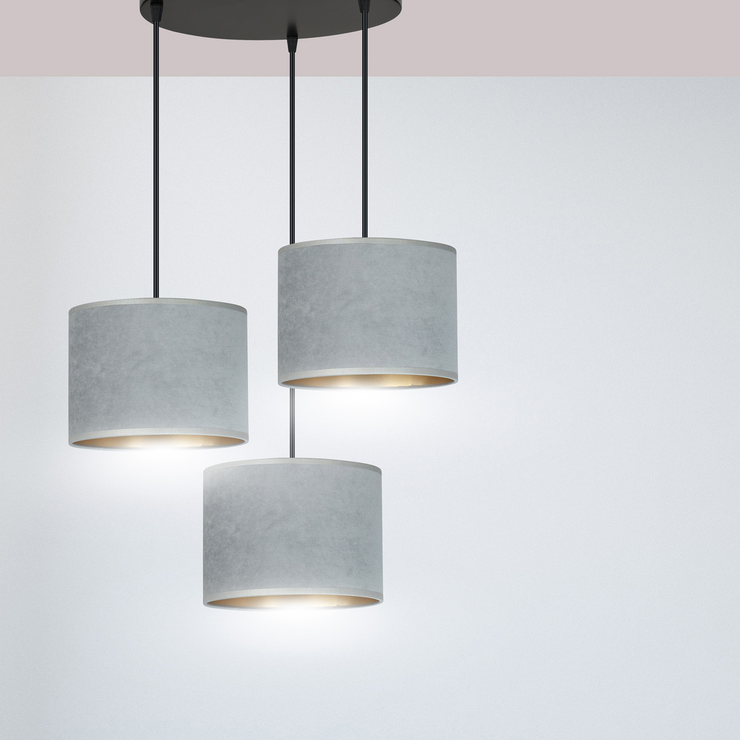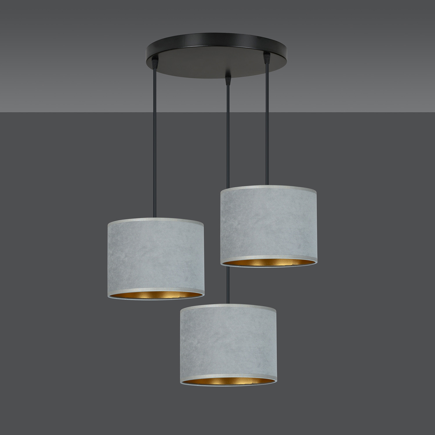 Lampadario 3 luci con base in metallo tonda di colore nero e 3 paralumi tessili di forma cilindrica di colore grigio all'esterno e dorati all'interno. La lunghezza regolabile dei cavi consente la personalizzazione in base alle esigenze individuali. I paralumi sono realizzati in materiale resistente con una texture vellutata e un centro dorato. La struttura semplice e l'elegante combinazione di colori lo rendono una scelta versatile per vari spazi.