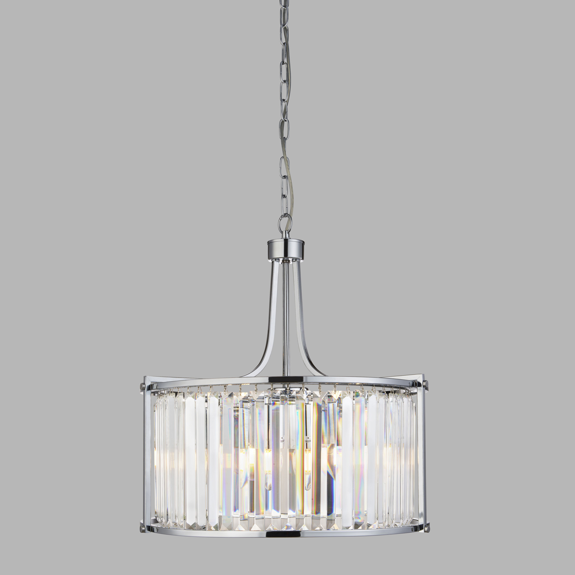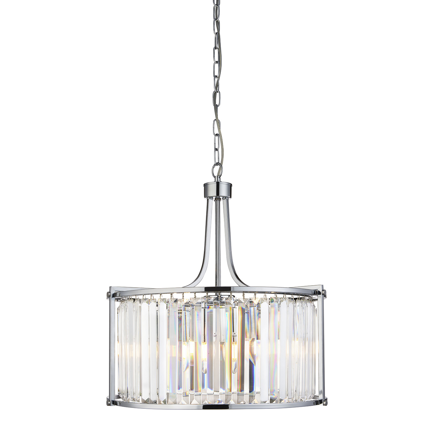 La gamma di luci Victoria offre uno stile tradizionale ma glamour per la tua casa. La sospensione Drum a 5 luci ha una finitura cromata che presenta un design in cristallo trasparente, questo crea un impatto gradevole quando illuminato, aggiungi questo pezzo audace al tuo spazio abitativo.