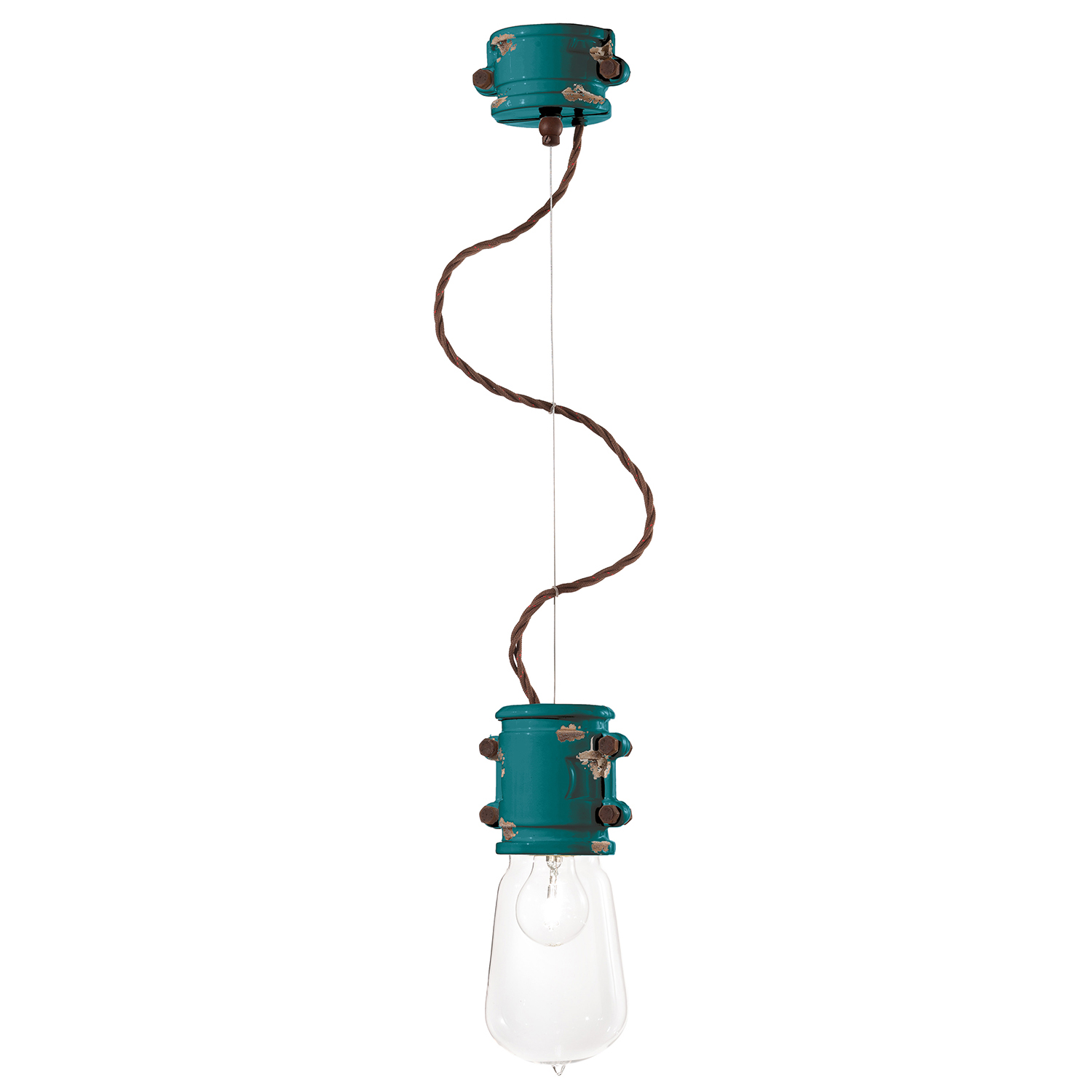 Collezione URBANL'INNOVAZIONE DAL SAPORE NOSTALGICOSospensione 1 Luce diam.12 cm in ceramica con finitura vintage azzurro lavorata a mano da artigiani specializzati...