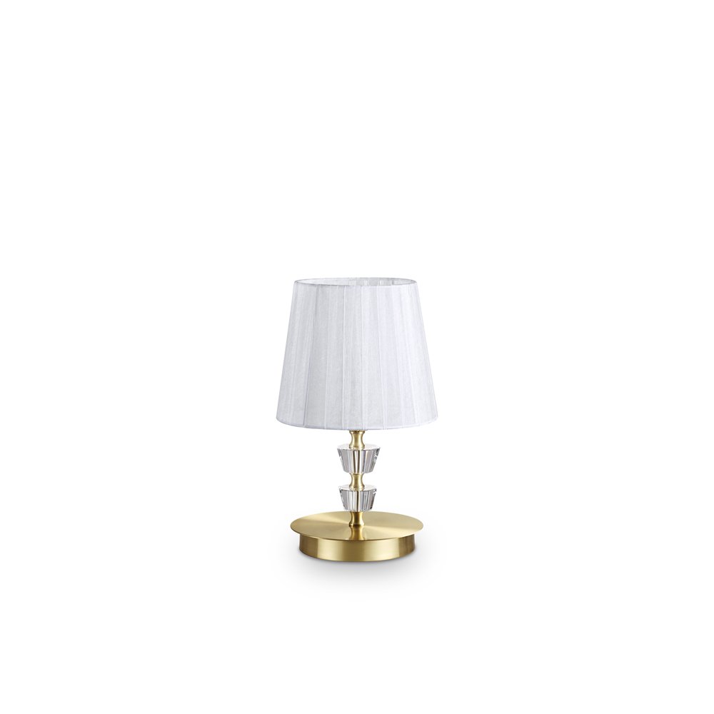 Lampada da tavolo a 1 luce con montatura in metallo finitura ottone satinato. Corpo centrale, bobeches e pendagli in cristallo molato. Paralume in organza.. Disponibile anche in bianco.