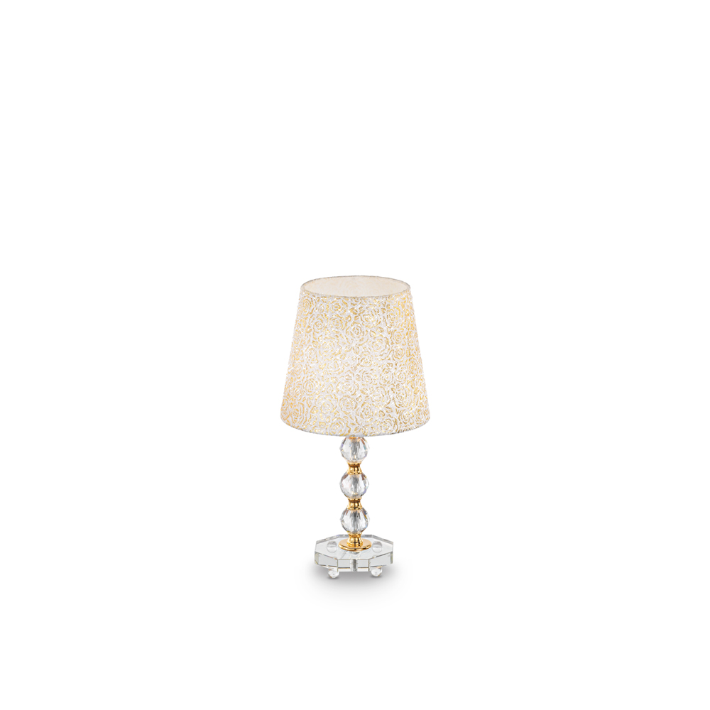Lampada da tavolo a 1 luce con montatura in metallo dorato con elementi decorativi e base in cristallo molato.. Paralume in lamina di PVC, rivestita in tessuto con decorazione trapuntata e brillantini dorati. Disopnibile in tre misure.
