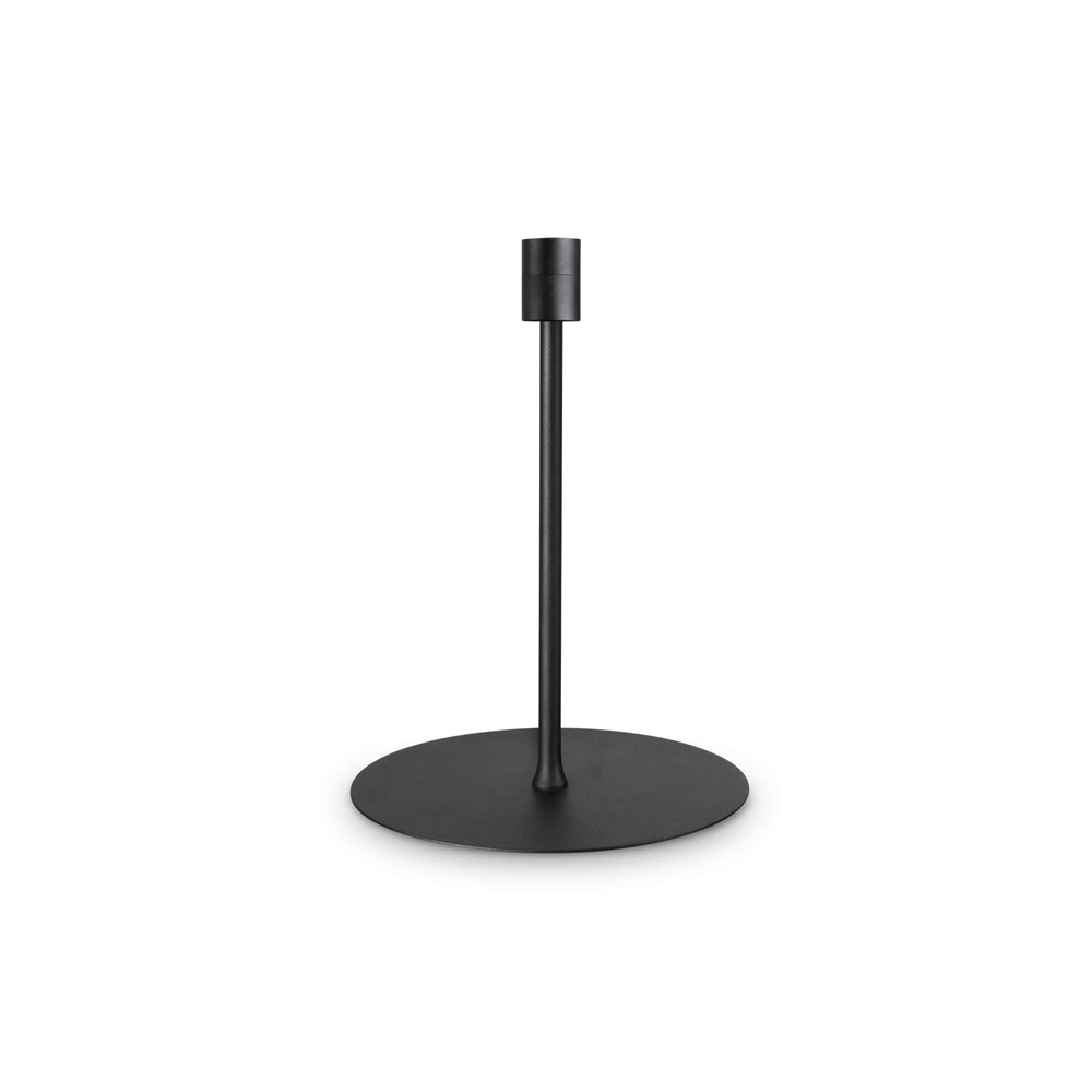 Lampada da tavolo h.33 cm e base diam.20 cm con attacco 1E27; Montatura in metallo verniciato a polveri nero ed interruttore integrato.. Paralumi in pvc ignifugo rivestito di tessuto. Colori paralumi: beige, bianco o nero.
