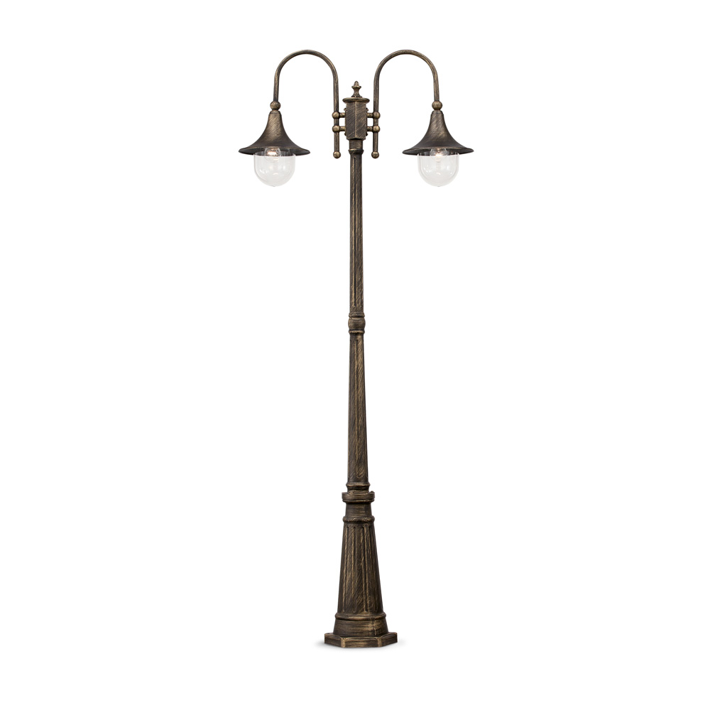 Palo a 2 luci con corpo luce interamente in alluminio pressofuso. Con finitura nero e oro antico. Diffusore in acrilico trasparente..