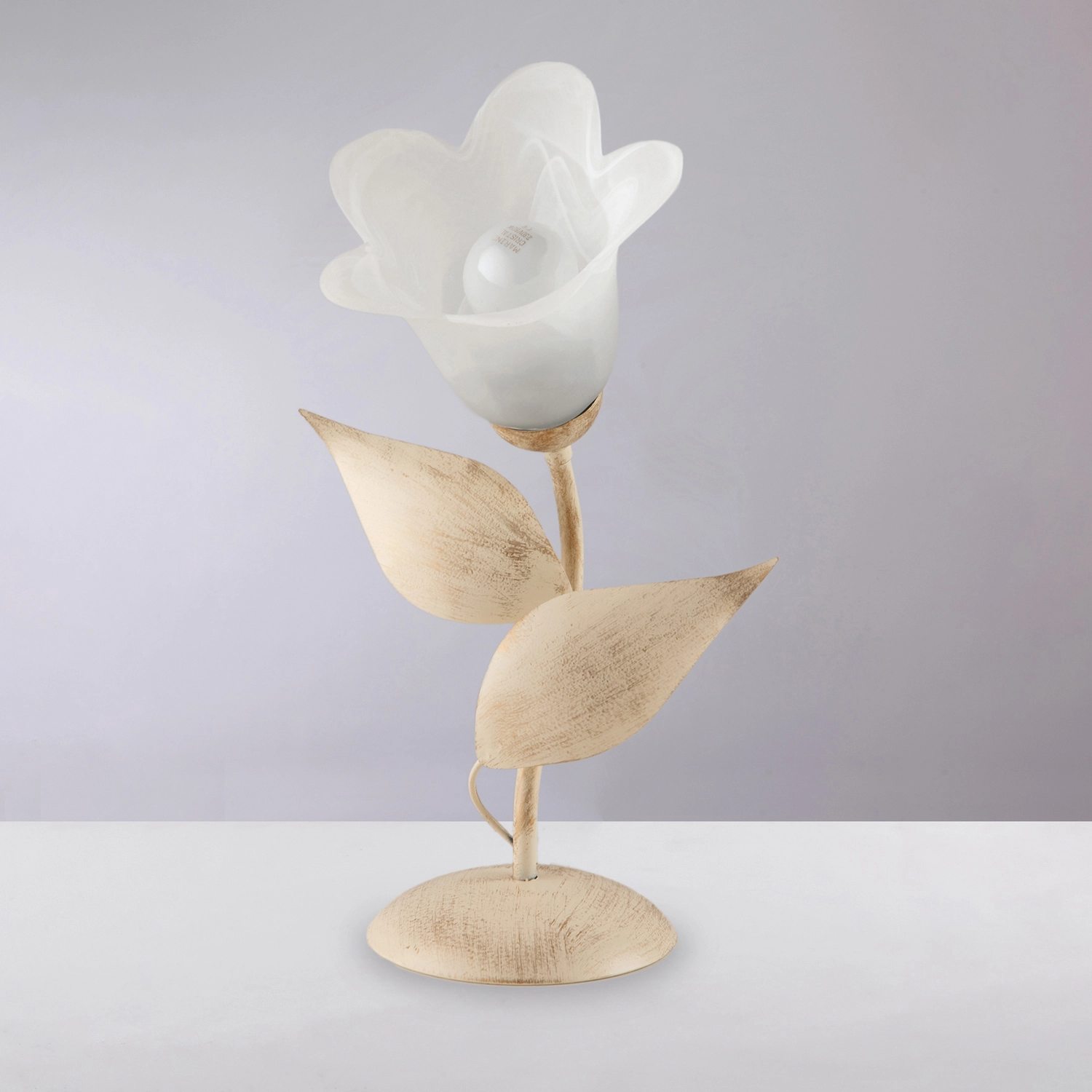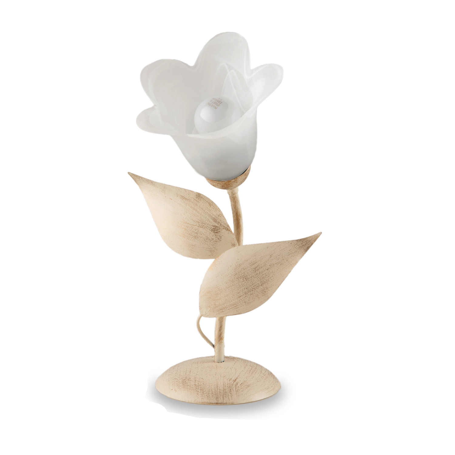 Lumetto 1 luce in ferro laccato avorio con decorazione effetto antichizzato oro e diffusore in vetro centrifugato alabastro bianco.. Il fusto adornato da foglie in metallo forgiate a mano ed il diffusore a fiore di questo lumetto delicato e grazioso, in perfetto stile shabby chic, adornerà con eleganza e raffinatezza ogni ambiente. Disponibile anche nella versione bianco e argento.