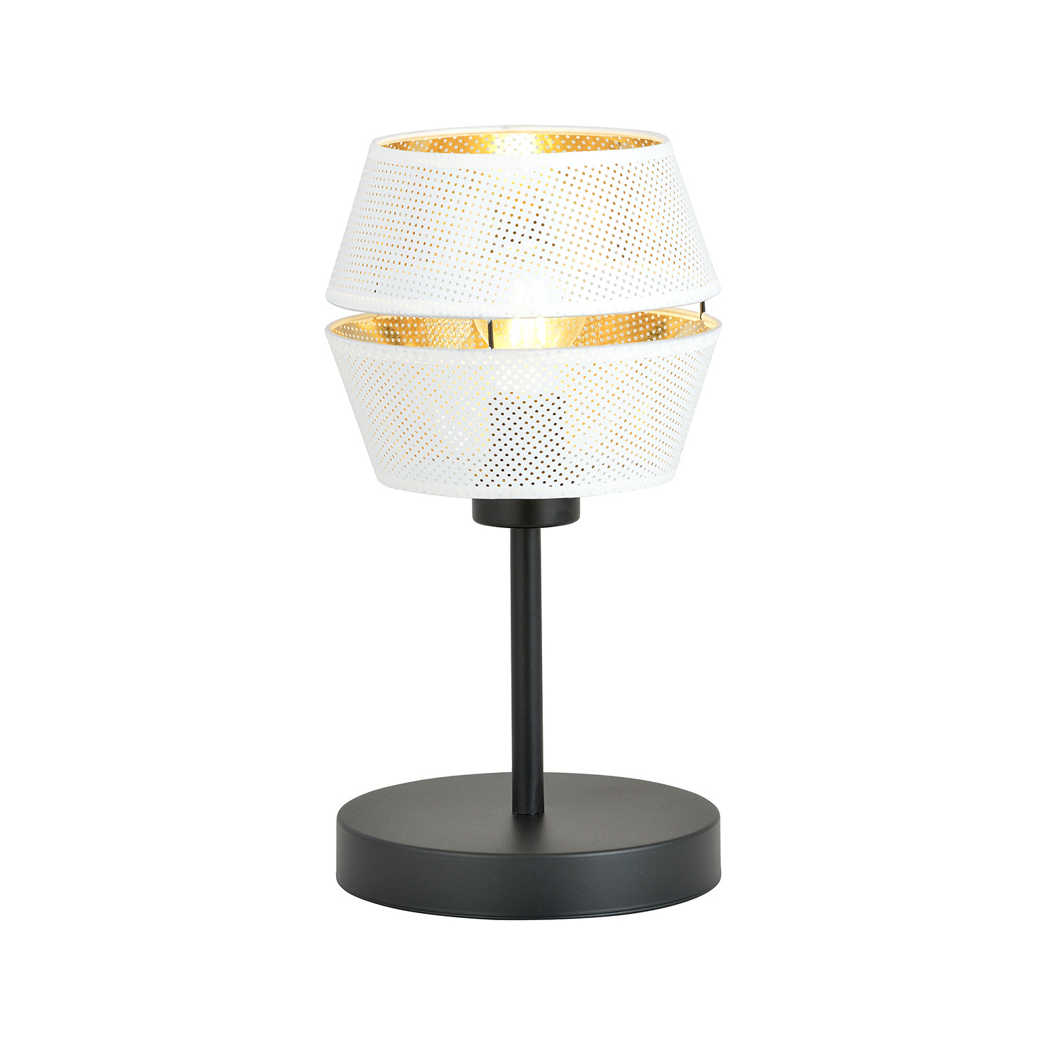 Lampada da tavolo a 1 luce con base in metallo nero e diffusore in rete metallica bianco all'esterno e oro all'interno.. Il suo paralume originale con interno dorato conferisce un carattere unico alla stanza. Creando un'atmosfera magica e suggestiva, irradia un calore sensuale. La costruzione semplice e l'elegante palette di colori garantiscono una perfetta armonia tra praticità e raffinatezza.