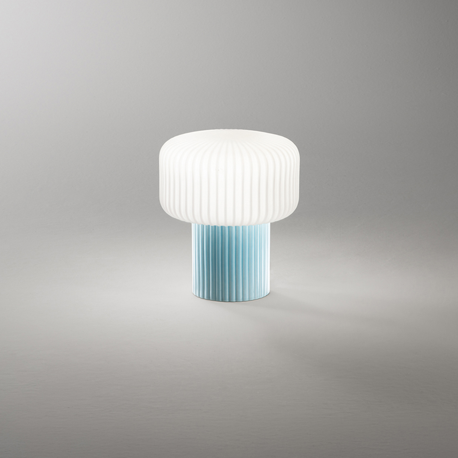 Collezione con struttura in ceramica plissettata nei vari colori. Diffusore in vetro soffiato bianco plissettato e acidato. Colore: Azzurro D.9 x H.19 cm Diffusore D.16 x H.10 cm 1 x G9 MAX 28W 220-240V 50/60Hz IP20 - Classe I Interruttore on/off sul cavo