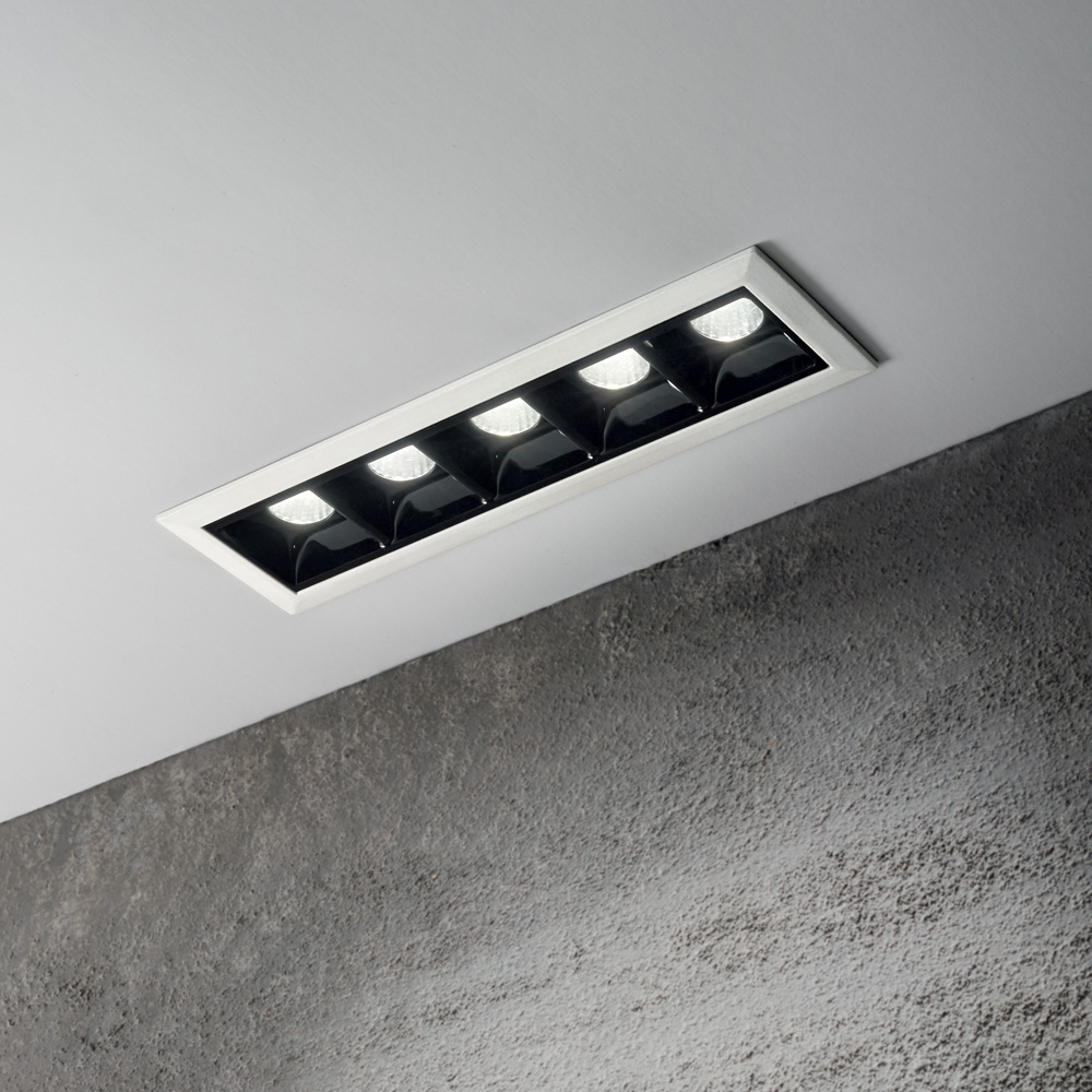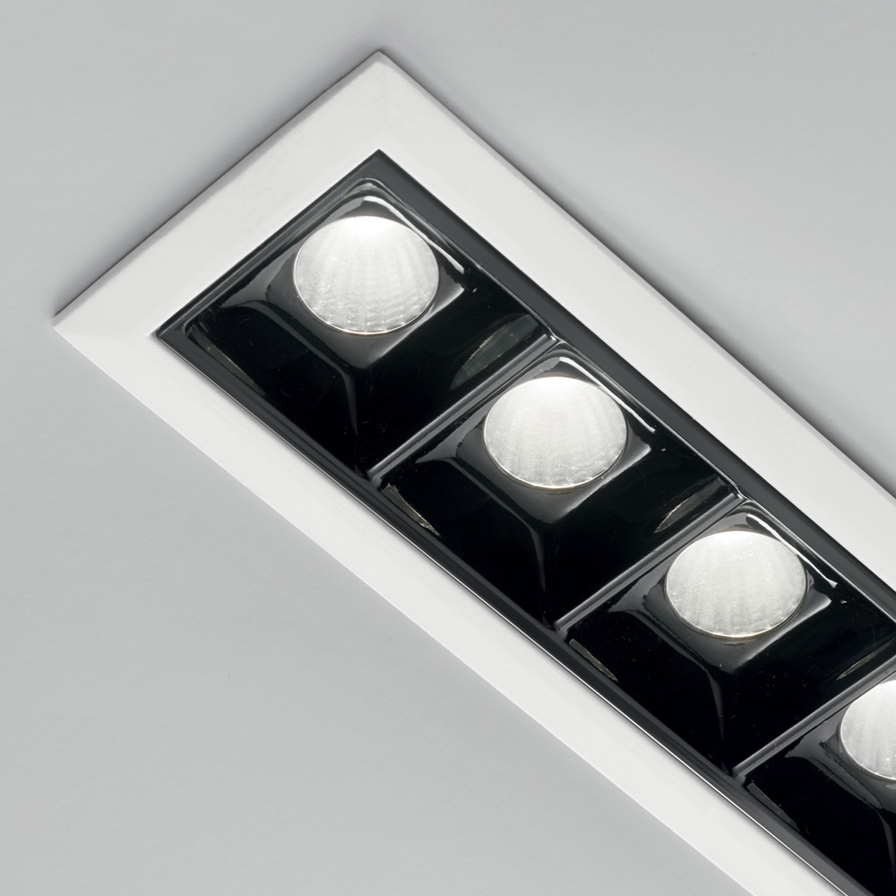 Collezione LIKAMODULI GEOMETRICIFamiglia di moduli a incasso LED rettangolari in alluminio pressofuso verniciato nero o bianco, con riflettore in policarbonato nero ..